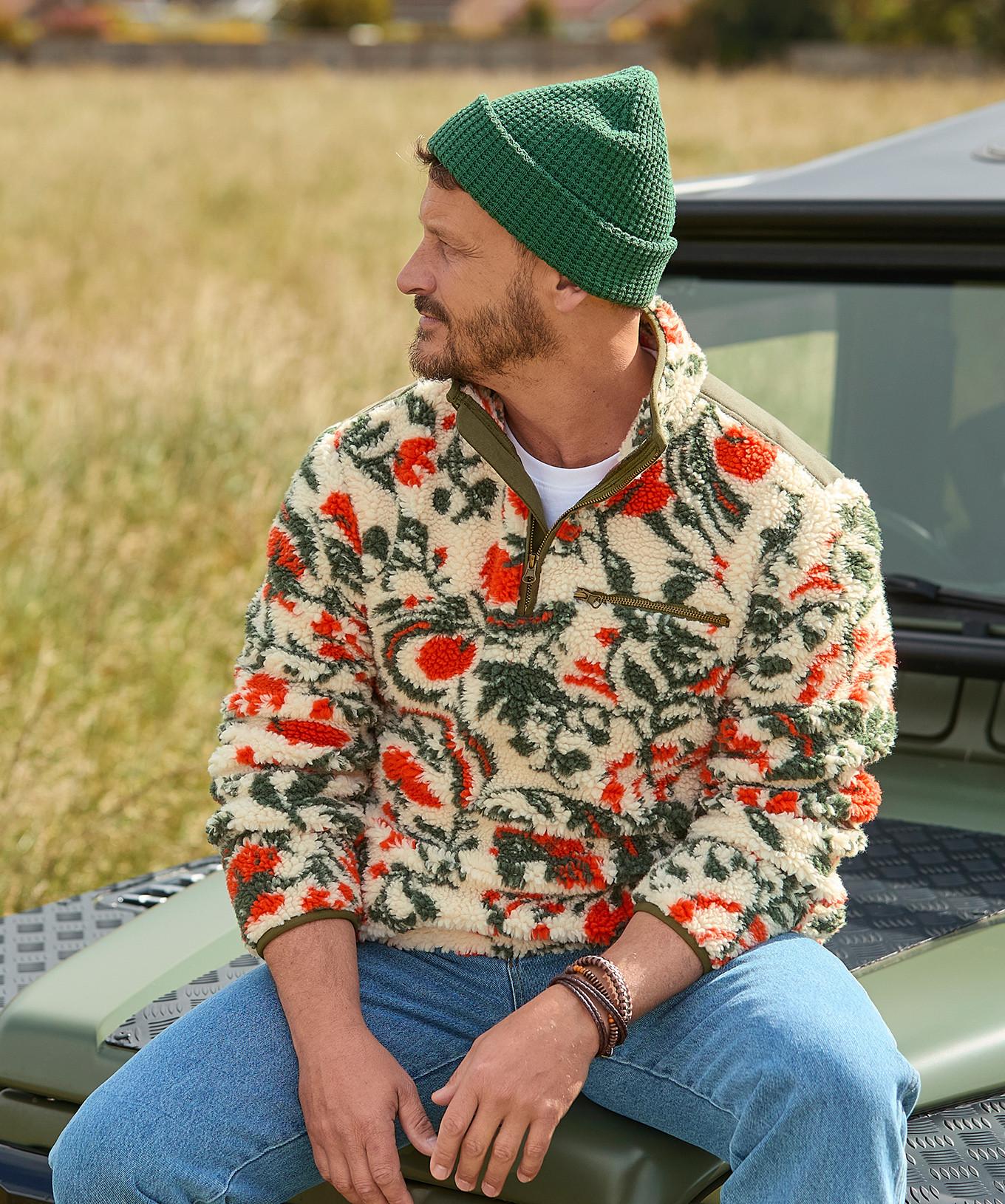 Dieser florale Trichter-Fleece bietet eine gemütliche und stilvolle Option für kühlere Tage. Das Design verfügt über ein lebhaftes Blumenmuster, das der klassischen Fleece-Silhouette eine persönliche Note verleiht. Er ist mit einem praktischen Halb-Reissverschluss ausgestattet, der eine anpassbare Belüftung und einfaches Schichten ermöglicht.