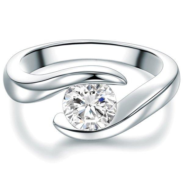 Sinnlich geschwungen, sanft fließend - dieser Verlobungsring der Manufaktur Trilani ist ein Handschmeichler der Extraklasse. Die besondere Form der Ringschiene zieht die Blicke magisch an und erobert das Herz Ihrer Liebsten in Sekundenschnelle. Scheinbar frei schwebend, ohne Fassung glitzert ein Zirkonia in spektakulärer Spannring-Optik an der Hand und reflektiert in seinen 57 Facetten das einfallende Licht. Dank des aufwändigen Brillantschliffs ist der Zirkonia kaum von einem echten Diamanten zu unterscheiden. Die rhodinierte Ringschiene aus 925er Sterlingsilber ist anlaufgeschützt und gut hautverträglich.