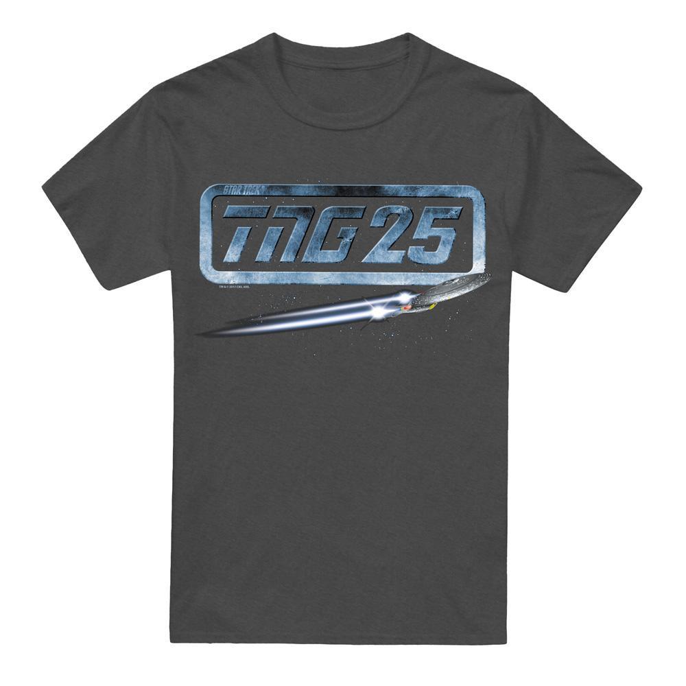 Dieses T-Shirt zeigt einen grafischen Druck, der "The Next Generation 25" mit dem ikonischen Enterprise-Raumschiff feiert. Es ist für Komfort und Stil konzipiert und eine vielseitige Ergänzung für jede Garderobe.