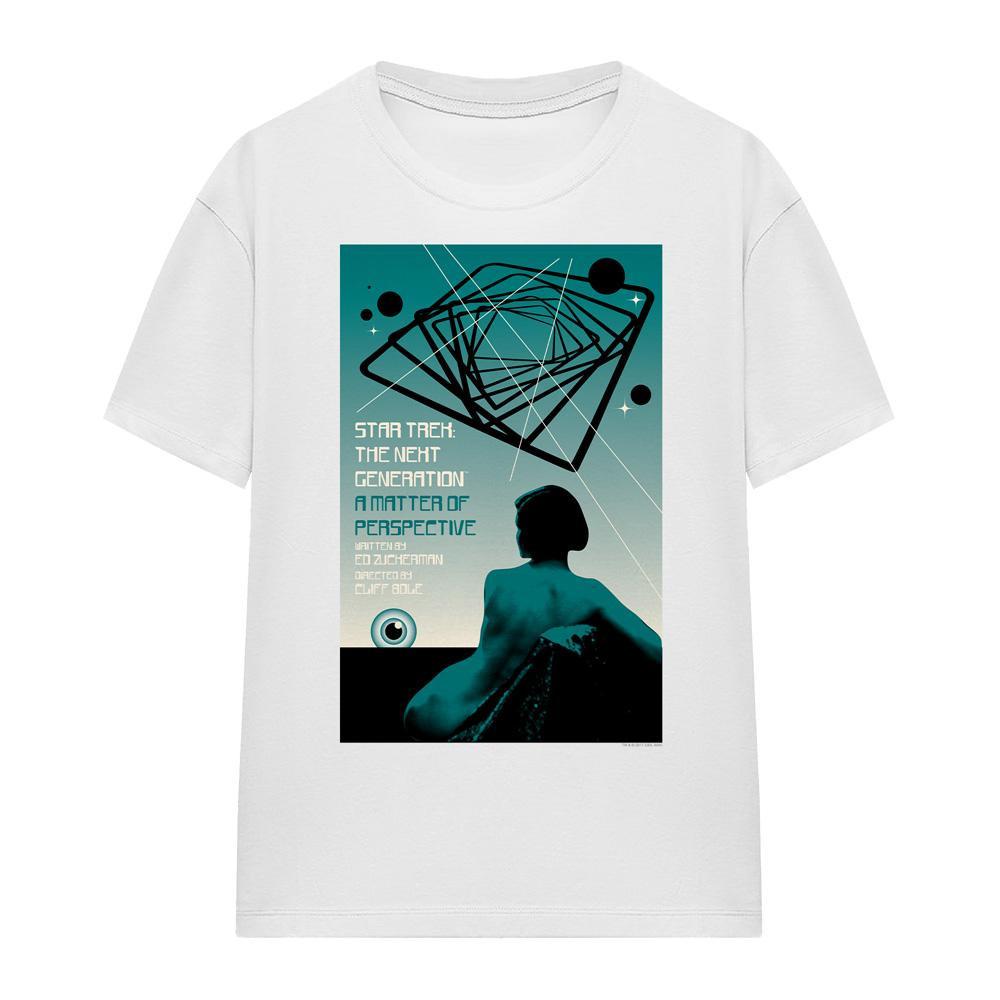 Dieses T-Shirt zeigt einen einzigartigen Grafikdruck, inspiriert von "Star Trek: The Next Generation" Staffel 3 Episode 14, mit dem Titel "A Matter of Perspective". Das Design fängt die Essenz der Episode ein, mit einer stilisierten Darstellung einer Figur, die auf ein komplexes geometrisches Muster blickt, vor einem kosmischen Hintergrund.
