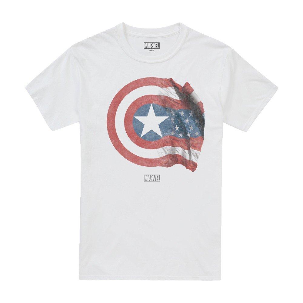 Dieses T-Shirt zeigt eine auffällige Grafik von Captain Americas ikonischem Schild, teilweise in eine wehende amerikanische Flagge verwandelt. Das Design ist mittig auf der Brust platziert und macht es zu einem markanten Statement-Stück für Fans des Superhelden. Der klassische Rundhalsausschnitt und die kurzen Ärmel bieten eine bequeme und vielseitige Passform für den Alltag.