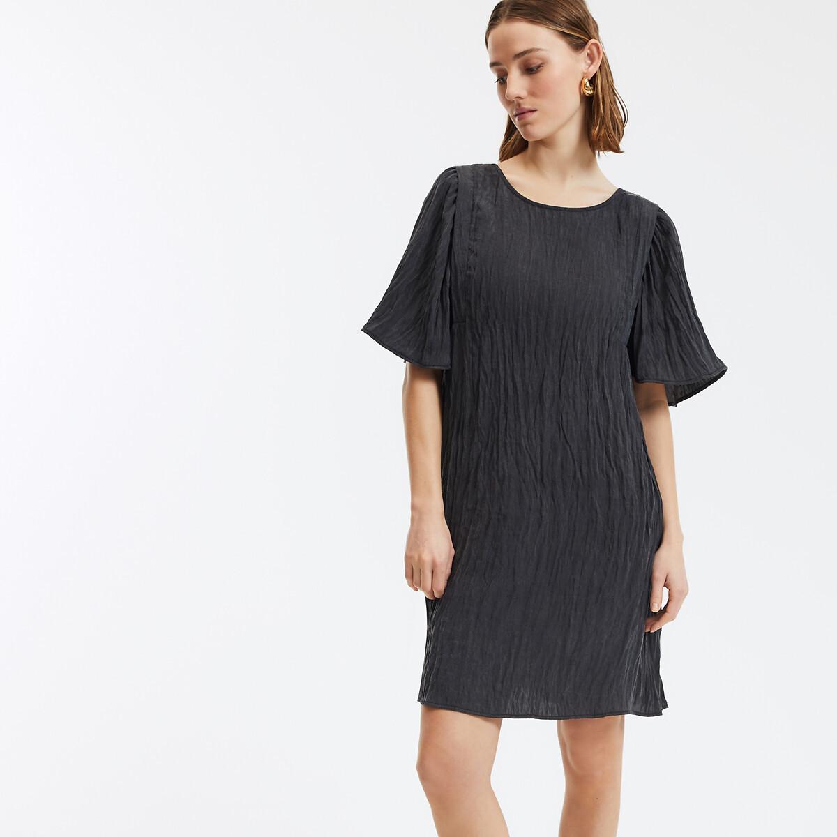Dieses kurze, fliessende Kleid hat vorne einen Rundhalsausschnitt und hinten einen quadratischen Ausschnitt mit Bindeband. Es verfügt über kurze Schmetterlingsärmel und einen ausgestellten Schnitt, der ihm mehr Weite verleiht. Aus Crinkle-Gewebe gefertigt, lässt sich dieses Kleid gut in den Urlaub mitnehmen.
