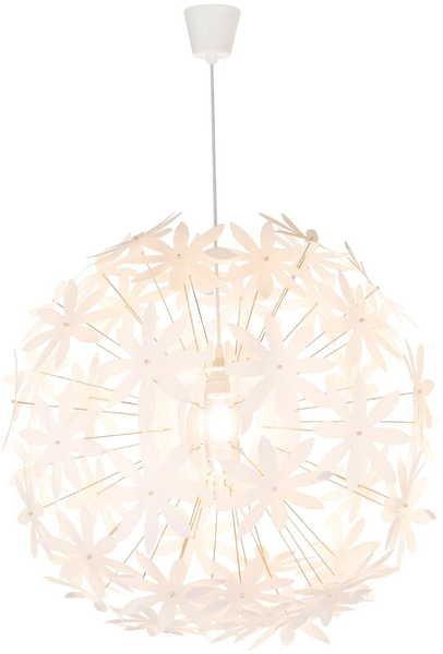 Diese auffällige kugelförmige (60cm) Hängelampe ist aus mehreren weissen Kunststoffblüten zusammengesetzt und sorgt damit für ein tolles Licht. Die verfügbare E27 Fassung überlässt Ihnen die Wahl des Leuchtmittels und somit der Lichtstärke und Lichtfarbe (max. 40W). Aufgrund ihrer Stromersparnis und Langlebigkeit empfehlen wir LED-Lampen.