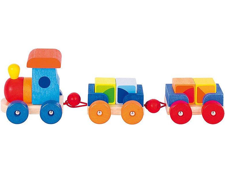 Entdecken Sie die bunte Holzlokomotive aus Gummibaumholz, die durch ihre klare Struktur besticht. Der Zug hat eine Länge von 31 cm und besteht aus 9 Teilen, die ideal zum Spielen und Erkunden für kleine Hände geeignet sind.