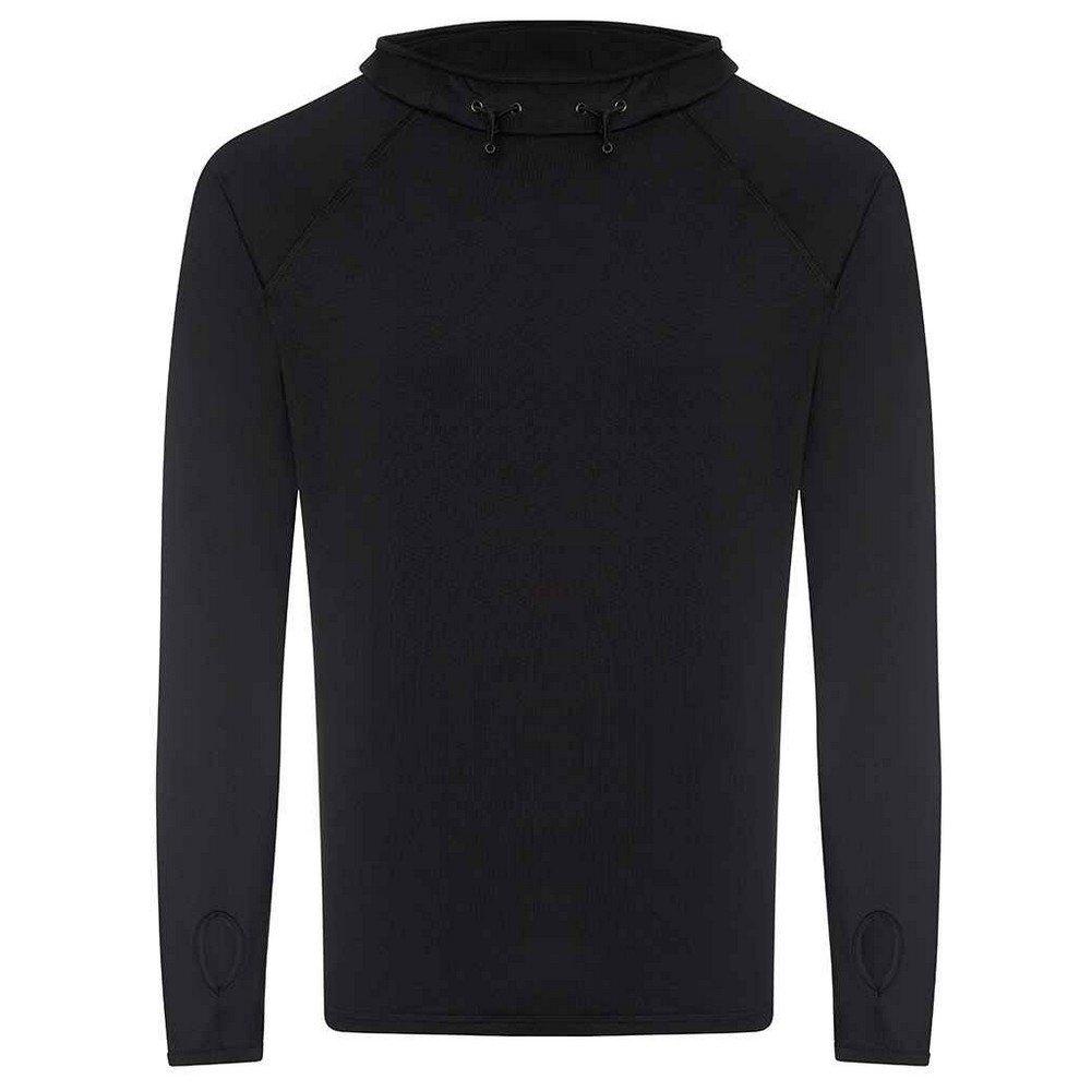 92% Polyester, 8% Elastan. Gewebetechnik: DynamicCool, Leicht. Design: Unifarben. Mit Overlock-Stich, Reflektierende Lasche, Abreiß-Etikett. GSM (Gramm pro Quadratmeter): 210. Nachhaltigkeit: Amfori-Freigabe, BSCI, PETA-geprüftes Vegan, Sedex, WRAP Zertifikat. Wasserfallausschnitt. Langärmlig, Raglanärmel. Bündchen: Daumenloch. Kapuzenmerkmale: Knebel-Einstellung. Saum: Doppelnähte.