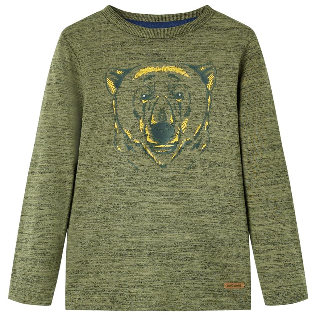 Dieses Kinder-T-Shirt hat lange Ärmel, einen Rundhalsausschnitt und eine gerade Passform. Dieses T-Shirt in Khaki Melange ist mit einem großen Bären bedruckt. Das Langarmshirt besteht zu 100 % aus Baumwolle und fühlt sich daher sehr weich und angenehm an.