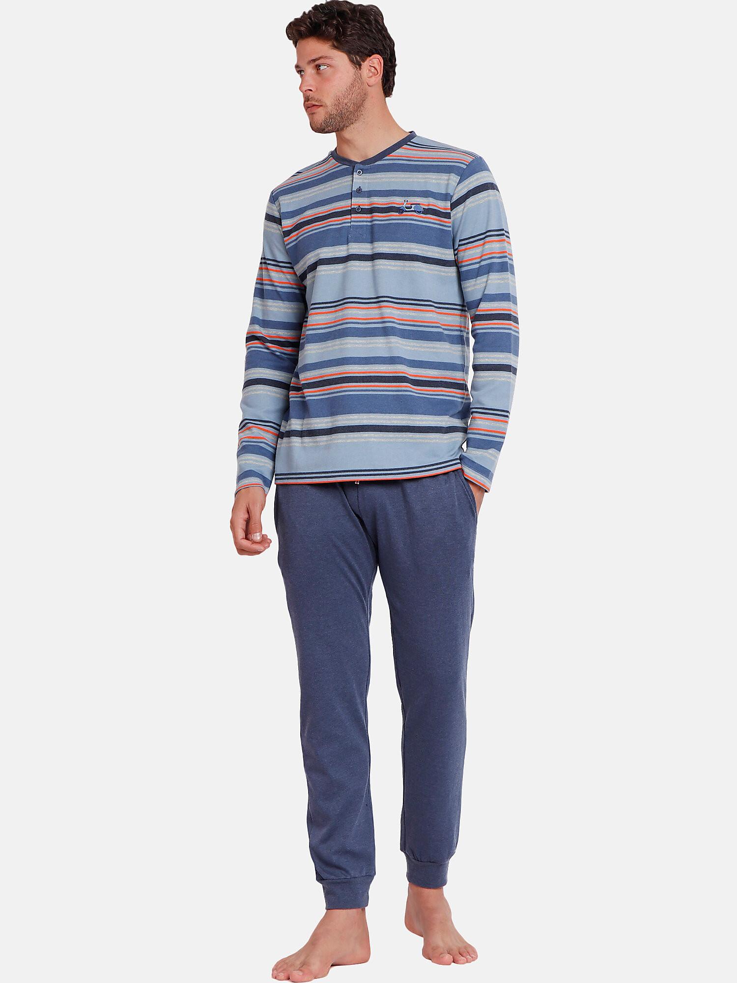 Dieses bequeme Pyjama-Set von Admas, das Rayas Vespa Style, besteht aus einer Hose und einem langärmeligen Oberteil. Es ist vollständig aus Baumwoll-Interlock-Stoff gefertigt und sorgt für leichte und angenehme Nächte. Die einfarbige Hose hat einen verstellbaren Kordelzugbund, praktische Seitentaschen und ist an den Knöcheln verengt, um eine bessere Passform und angenehmen Tragekomfort zu gewährleisten. Das langärmelige Oberteil weist über die gesamte Fläche gewebte, mehrfarbige horizontale Streifen auf und ist mit einem gestickten Vespa Admas-Detail auf der Vorderseite des Oberkörpers verziert. Der Rundhalsausschnitt kann mit einer Knopfleiste geschlossen oder geöffnet werden. Der Stoff fühlt sich weich und angenehm auf der Haut an. Dieses Set ist ideal für Herbst- und Winternächte oder entspannte Tage zu Hause.
