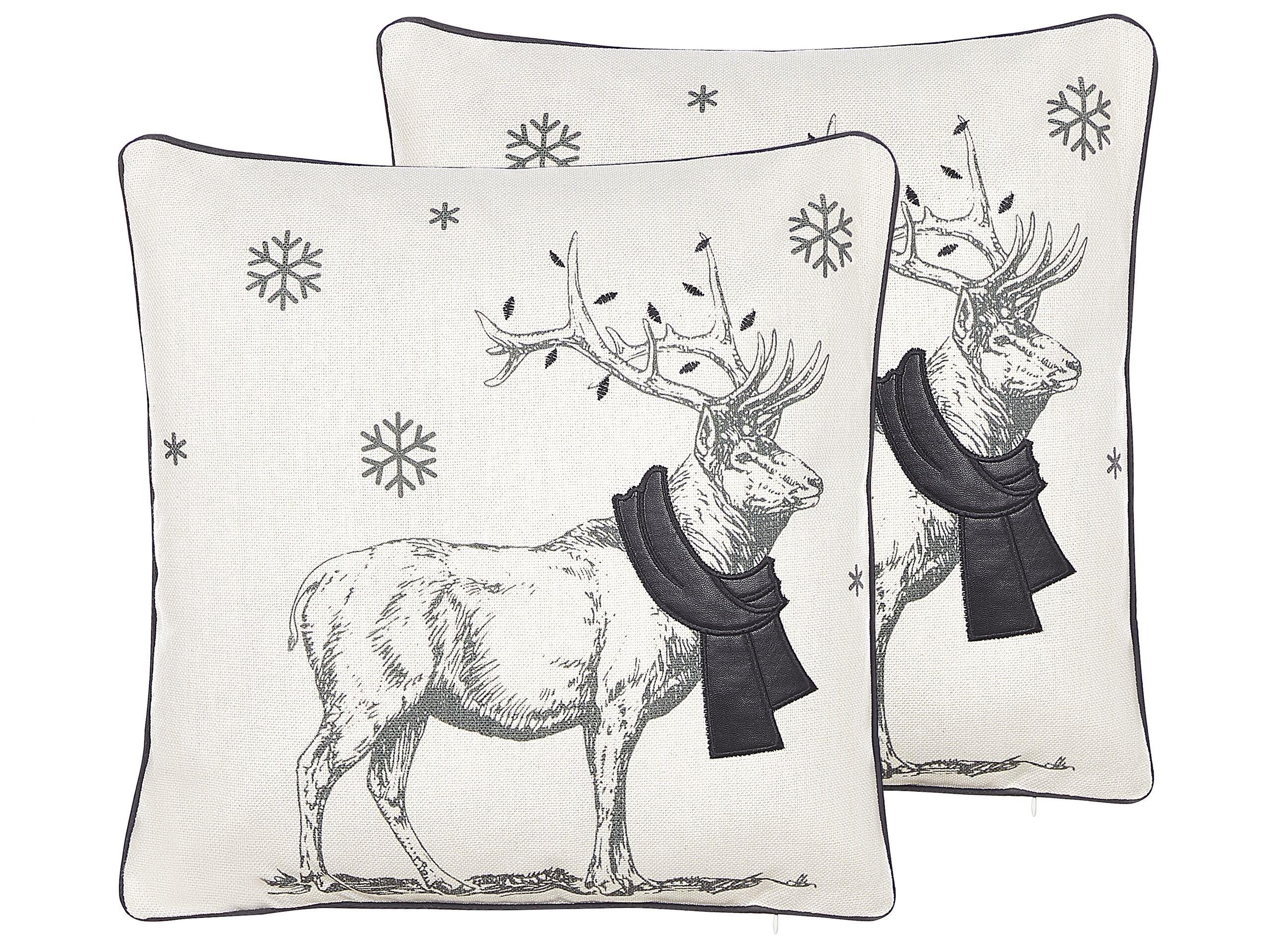 2er-Set Weihnachts-Streukissen. Unterstreichen Sie Ihre weihnachtliche Dekoration mit diesem Set aus zwei wunderschönen Dekokissen. Sie sind aus strapazierfähigem Polyester gefertigt und verfügen über eine weiche Füllung für höchsten Komfort. Die Vorderseite jedes Bezuges ist mit der Silhouette eines Rentiers auf einem cremefarbenen Hintergrund verziert. Die Ränder der Kissen sind mit kontrastierenden Paspeln versehen, die zum Schal des Tieres passen. Sie sind eine grossartige Ergänzung für jedes minimalistische, moderne oder traditionelle Ambiente.