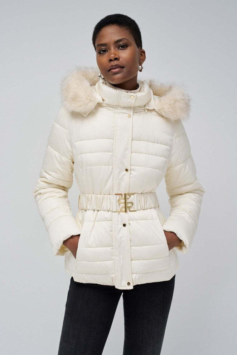 Der Short Puffer Coat With Fur Hood in Light Beige ist die perfekte Kombination aus Stil und Funktionalität für kalte Tage. Diese langärmelige Steppjacke verfügt über eine Kapuze mit Kunstpelzbesatz, die zusätzliche Wärme und Eleganz bietet. Der verdeckte Reissverschluss und der Druckknopfverschluss sorgen für einen sicheren Verschluss, während der Taillengürtel mit auffälliger Logo-Schnalle eine feminine Silhouette betont. Praktische seitliche Eingrifftaschen bieten Platz für kleine Essentials.