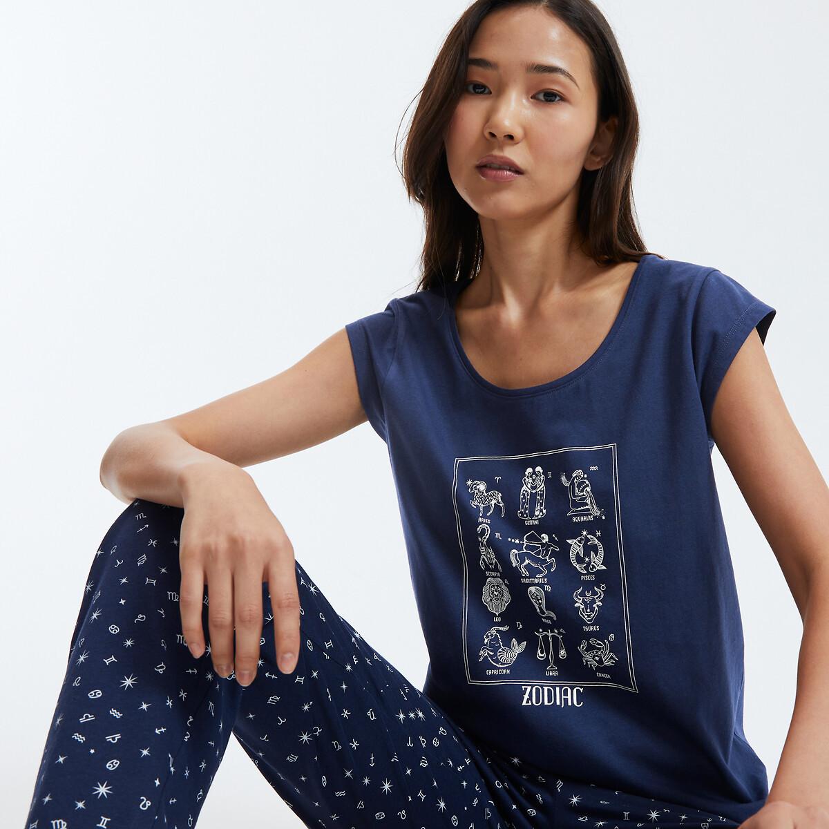Dieses Pyjama-Set besteht aus einem kurzärmeligen Oberteil mit Rundhalsausschnitt und einem Sternzeichen-Print auf der Vorderseite. Die lange Hose ist mit einem dezenten Allover-Sternenmuster verziert, das das Design des Oberteils ergänzt. Dieses Set ist für angenehmen Tragekomfort konzipiert.