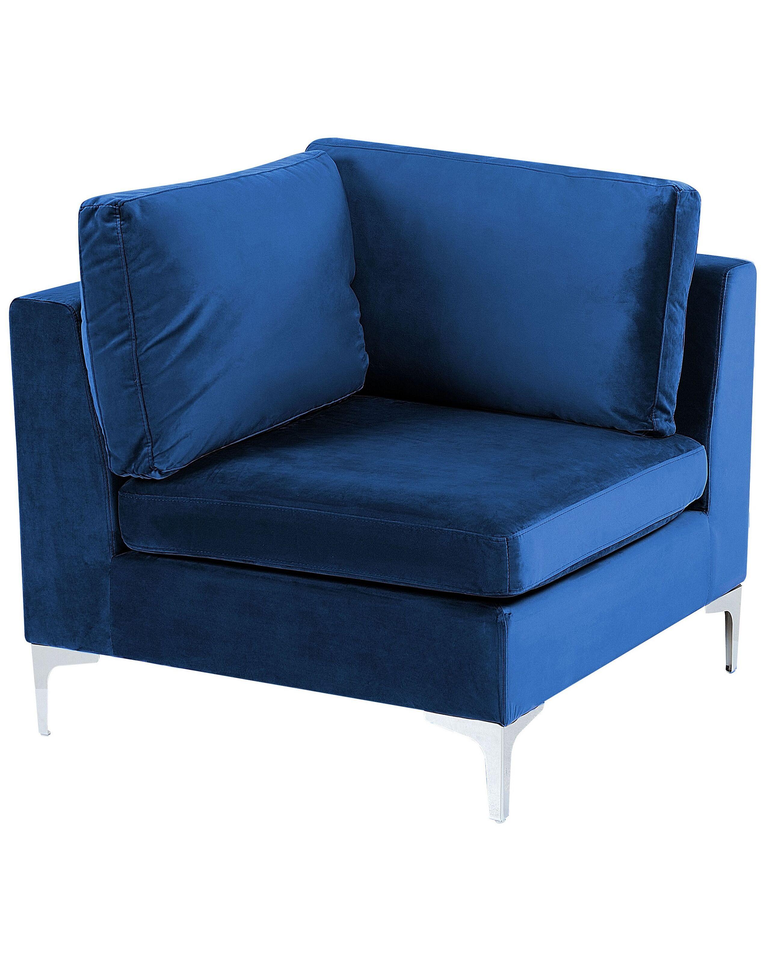 Klassisches Eckelement im trendigen Marineblau. Ob als selbstständiges Möbelstück oder als ein Modulelement eines Ecksofas oder einer grösseren Wohnlandschaft – dieses Eckteil ist einfach vielseitig einsetzbar. Es besitzt einen hochwertigen Rundumbezug aus Samtstoff, sowie abnehmbare Kissenbezüge, weshalb es auch für Familien mit Kleinkindern oder Tierliebhaber eine gute Wahl sein kann. Die trendige Farbgebung in Marineblau korrespondiert ausgezeichnet mit den verchromten Metallbeinen in Silberoptik, weshalb es äusserst modern, edel und einladend wirkt.