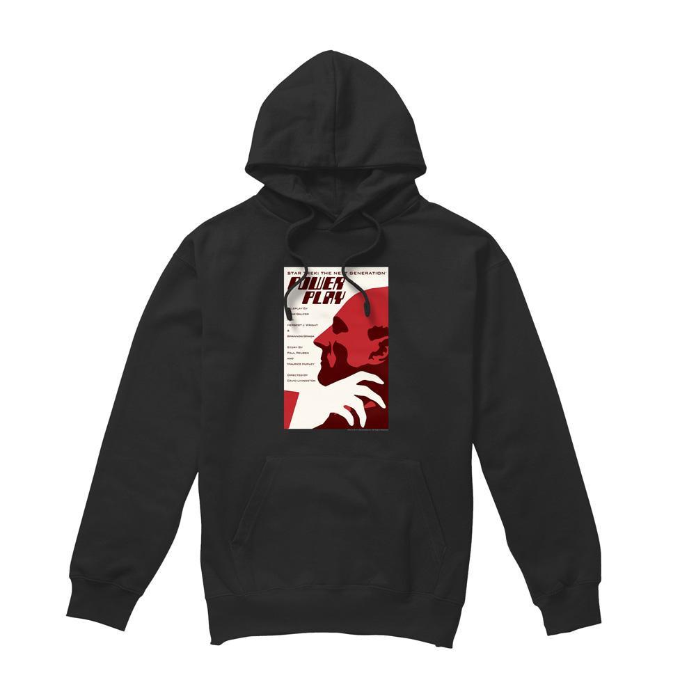 Dieser Kapuzenpullover zeigt einen Grafikdruck, inspiriert von "Star Trek: The Next Generation" Staffel 5 Episode 15, mit dem Titel "Power Play". Das Design präsentiert eine auffällige rot-weisse Illustration auf schwarzem Hintergrund, die die Essenz der Episode einfängt.