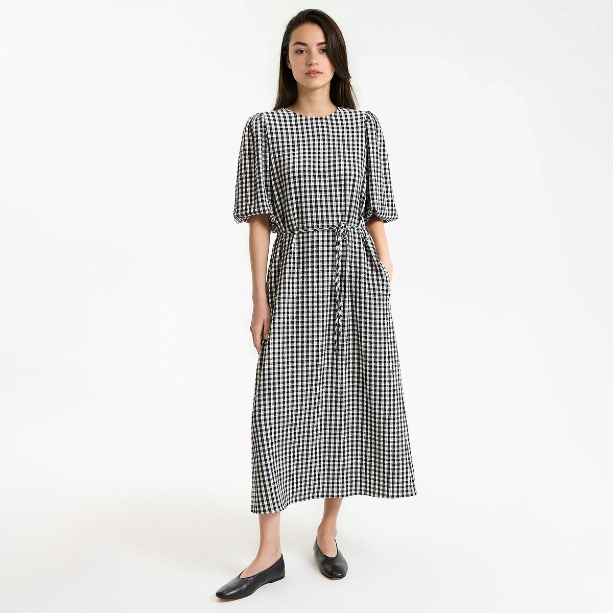 Das lange Kleid wurde neu interpretiert und mit einem Vichykaro-Print sowie einer leicht geprägten Textur versehen. Die kurzen Ärmel mit Balloneffekt sorgen für Volumen und einen femininen Touch. Das ikonische Vichykaro-Muster ist ein absolutes Must-have dieser Saison !