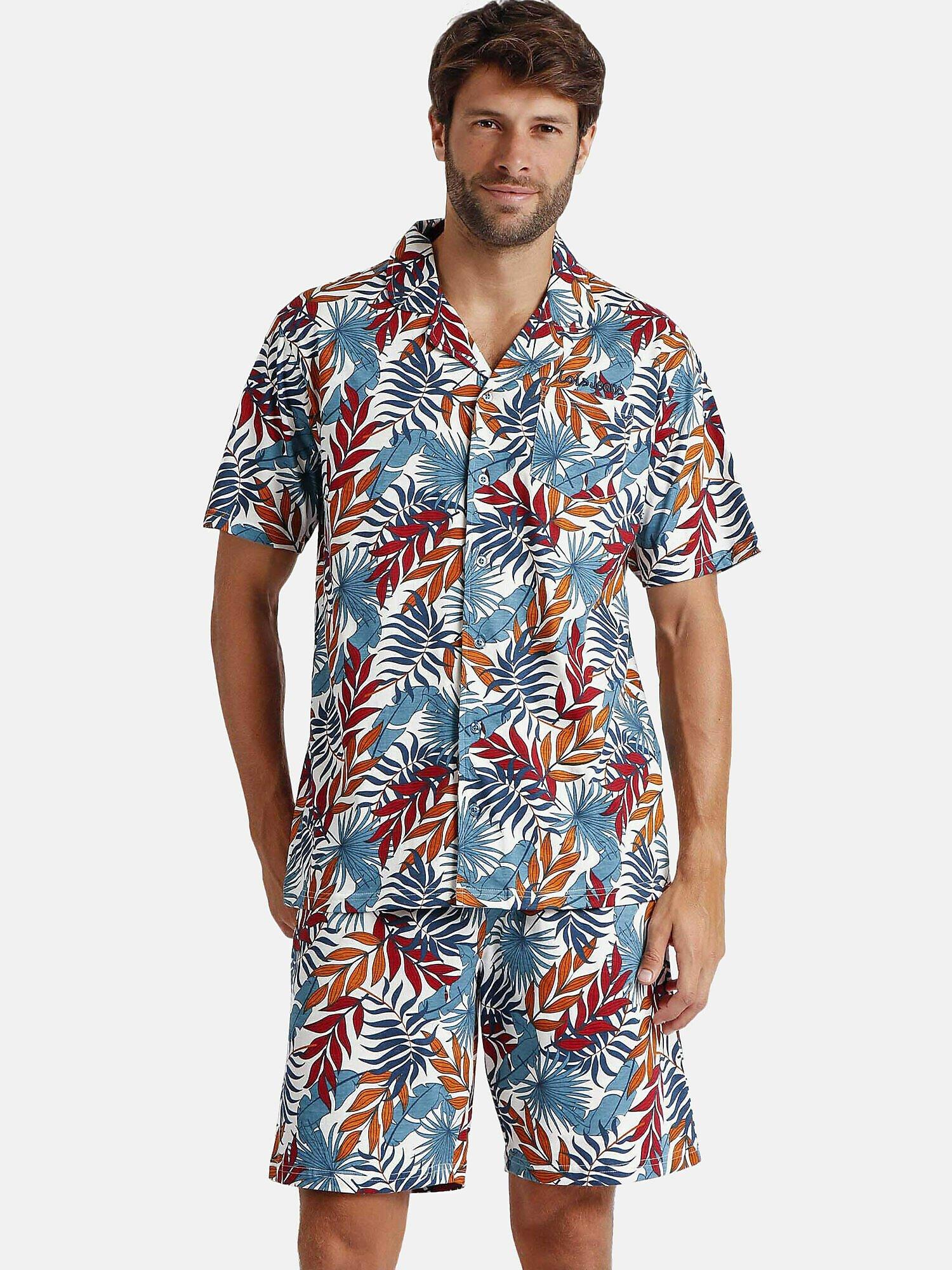 Dieses Pyjama-Set besteht aus einem kurzärmeligen Hemd und passenden Shorts, die beide mit einem lebhaften tropischen Blattmuster verziert sind. Das Hemd hat einen klassischen Kragen und eine durchgehende Knopfleiste, die eine entspannte Passform für angenehmen Tragekomfort bietet. Die Shorts sind für Bewegungsfreiheit konzipiert, wodurch dieses Set ideal zum Faulenzen oder Schlafen ist.