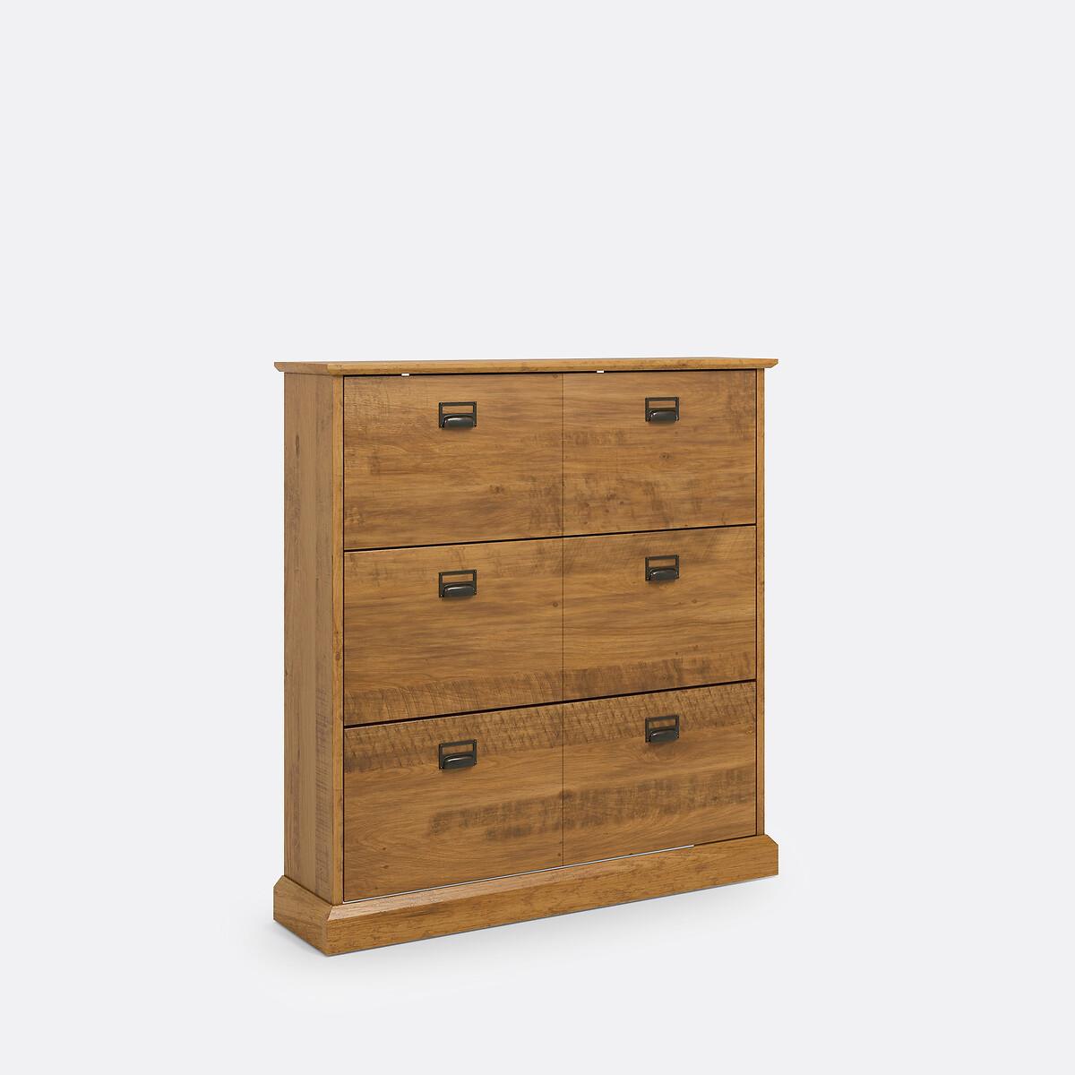 Schuhschrank Lindley mit 3 Fächern. Dieser platzsparende Schuhschrank bietet hinter seinen 3 Klappen Platz für die Schuhe der ganzen Familie.