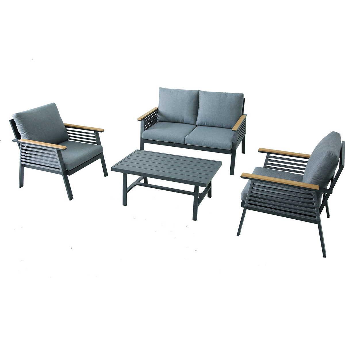 Die Lounge-Gruppe Denia, ein luxuriöses Ensemble aus Dunkelgrau Aluminium, Non-Wood und Seilbespannung, verwandelt Ihren Aussenbereich in eine stilvolle und gemütliche Oase. Mit bequemen grauen Kissen aus haltbarem Olefin, einem geräumigen 2-Sitzer, zwei Sesseln und einem eleganten Tisch, bietet dieses Set eine moderne Ästhetik und überlegene Haltbarkeit.