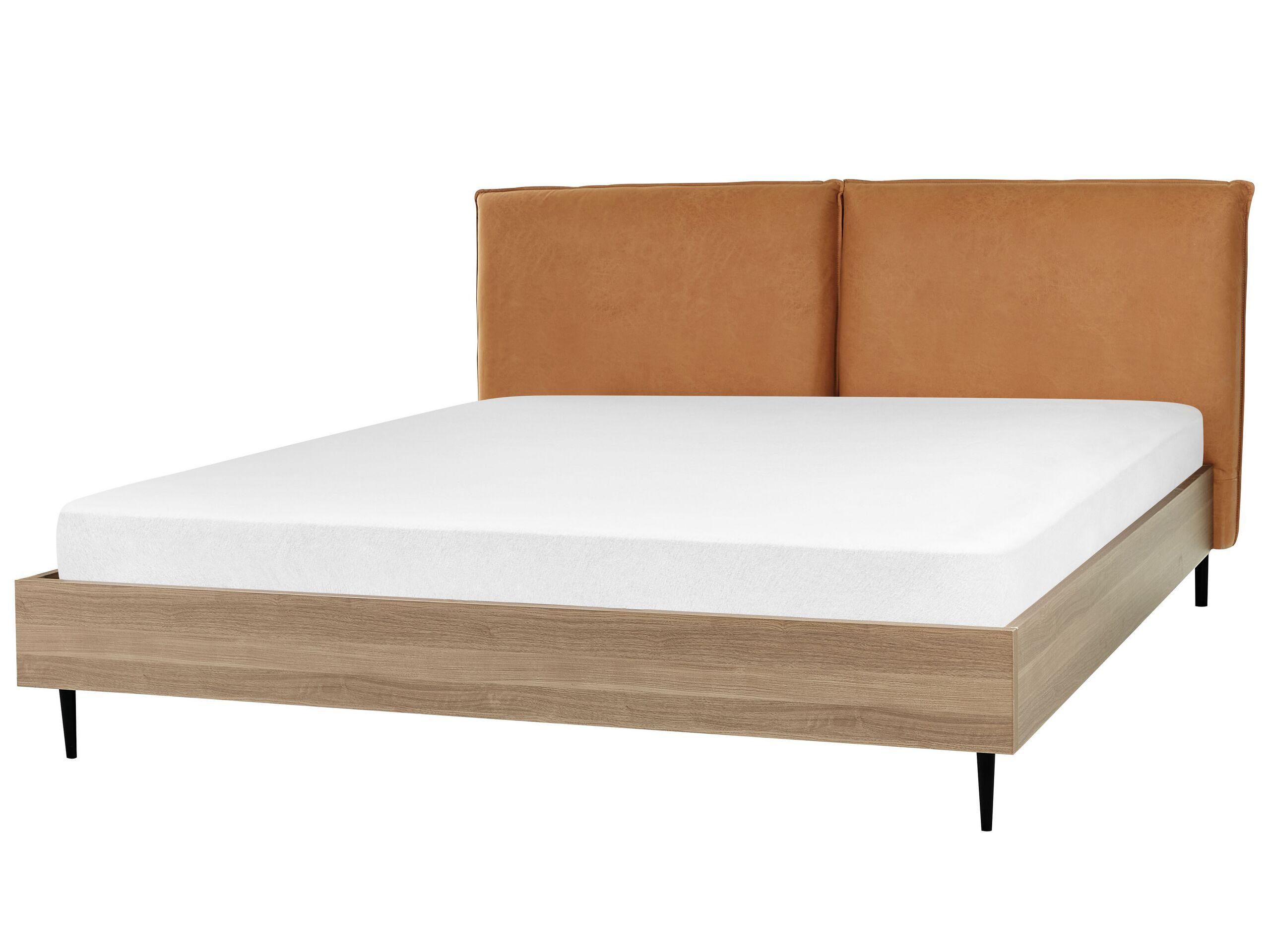 Modernes Bett mit Holzrahmen und gepolstertem Kopfteil. Bringen Sie einen modernen Touch in Ihr Schlafzimmer mit diesem Bett, das mit einem gepolsterten Kopfteil ausgestattet ist. Der dezente MDF-Holzrahmen und die schwarzen Metallfüsse sorgen für Stabilität, während die robusten Latten aus Pappelholz für einen angenehmen Schlaf sorgen. Das Kopfteil aus goldbraunem Kunstleder verleiht dem Design des Bettes einen Hauch von Eleganz und macht es zu einem stilvollen Mittelpunkt für jedes Schlafzimmer.