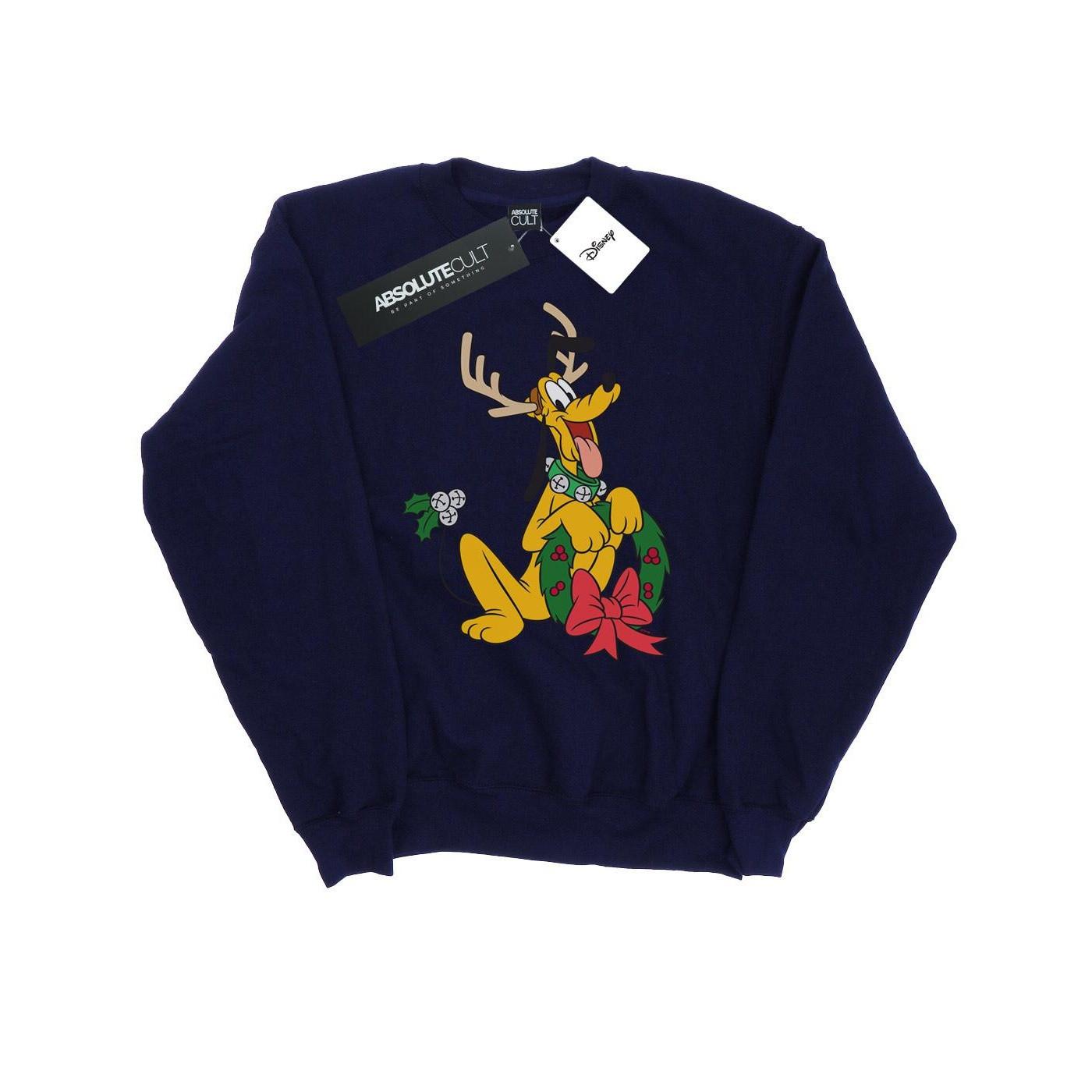 Dieses Sweatshirt zeigt ein festliches Design von Disneys Pluto, geschmückt mit Geweih und einem Weihnachtskranz. Es ist eine bequeme und stilvolle Wahl für die Weihnachtszeit.