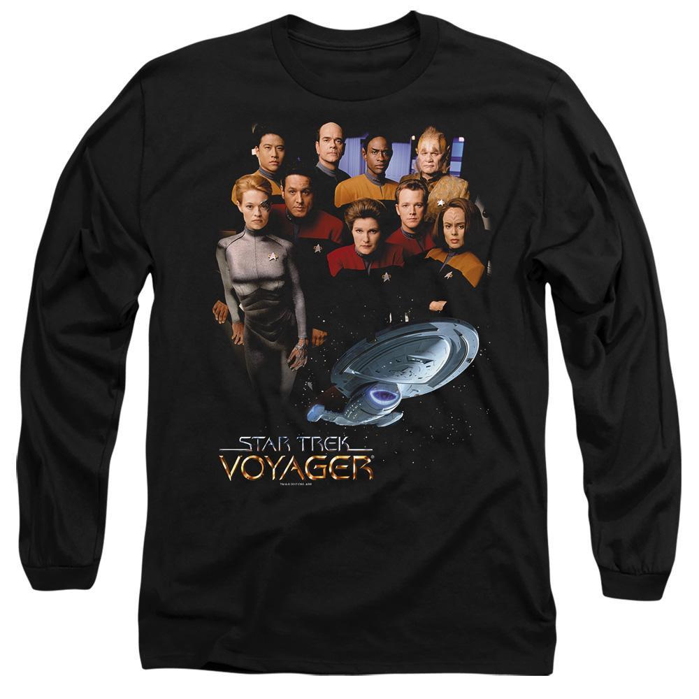 Dieses Langarm-T-Shirt verfügt über einen klassischen Rundhalsausschnitt und einen auffälligen Grafikdruck auf der Vorderseite. Das Design zeigt die ikonische Star Trek: Voyager Crew und ihr Raumschiff und ist somit die perfekte Wahl für Fans der Serie.