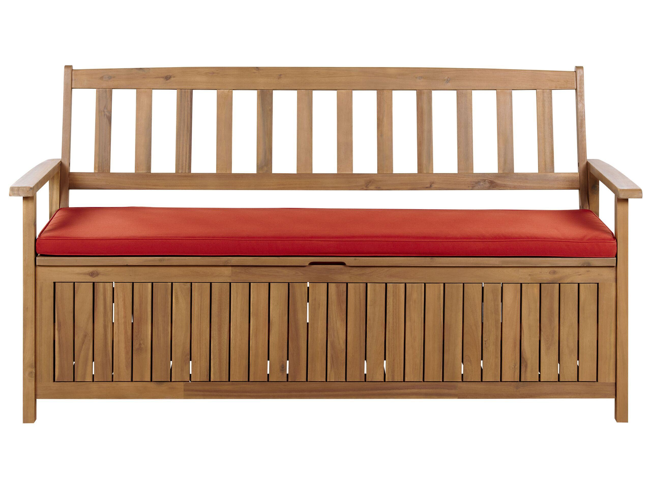 Moderne Outdoor-Sitzbank aus hochwertigem Akazienholz mit praktischer Aufbewahrungsbox und Auflage. Mit dieser geräumigen Gartenbank aus widerstandsfähigem Akazienholz bieten wir Ihnen gleichzeitig eine bequeme Sitzmöglichkeit und Stauraum. Blitzschnell verschwinden Sitzkissen, Gartengeräte oder andere Dinge unter der leicht aufklappbaren Sitzfläche. Um den Sitzkomfort der Bank zu erhöhen, ist sie mit einem zusätzlichem Sitzkissen ausgestattet. Dank den praktischen Befestigungsbändern kann die Auflage nicht verrutschen und trotzt so jedem sommerlichen Windhauch.