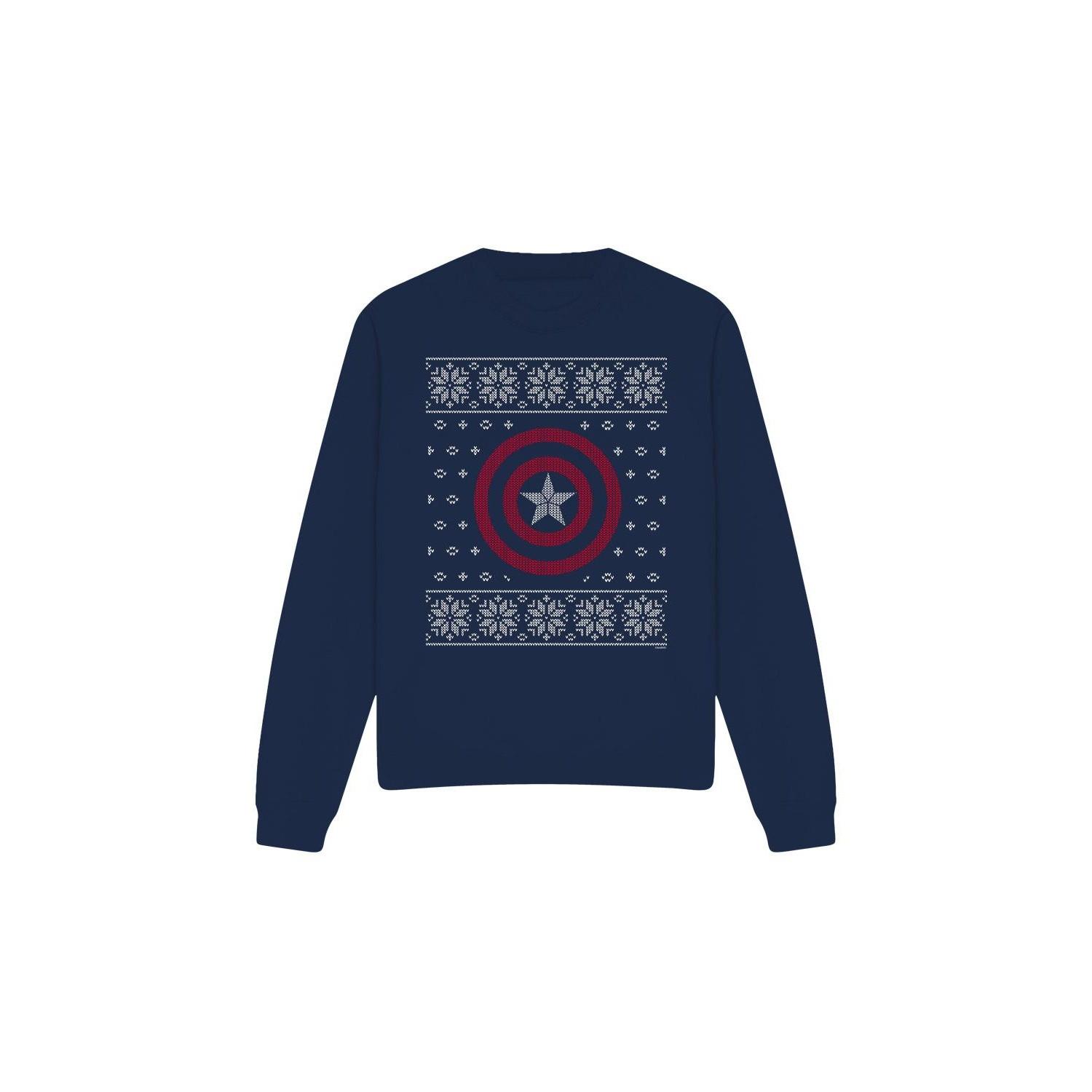 Dieses Sweatshirt präsentiert ein festliches "Ugly Christmas Sweater"-Design mit einem prominenten Captain America Schildmotiv in der Mitte. Das Design wird durch Schneeflocken- und Sternmuster ergänzt, was es zu einer lustigen und einzigartigen Ergänzung für jede Weihnachtsgarderobe macht.