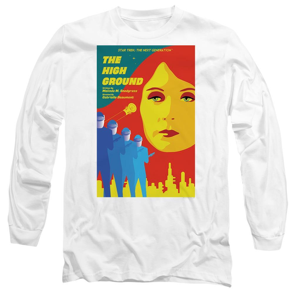 Dieses T-Shirt zeigt einen Grafikdruck, der von „The High Ground“, Staffel 3 Episode 12 von Star Trek: The Next Generation inspiriert ist. Das Design fängt die Essenz der Episode mit einer lebendigen und stilisierten Illustration ein.