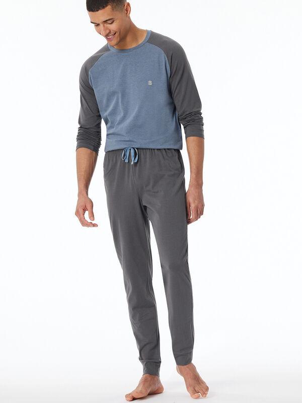 Dieser Pyjama bietet Komfort und Stil für entspannte Stunden zu Hause. Das Langarmshirt verfügt über einen Rundhalsausschnitt und sportliche Raglan-Ärmel, während die lange Hose einen stoffbezogenen Mehrnadel-Bund mit Bindekordel und angenehme Bündchenabschlüsse an den Beinen hat.