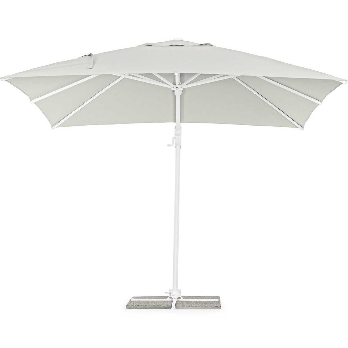 Ampelschirm Eden 300x300 weiss natur. Gestell aus pulverbeschichtetem Aluminium (Polyester). Mast 90x60mm. 8 Streben 25x17mm. Polyestergewebe 250g/m2 mit Beschichtung aus PA (Polyamid). Stahl-Standkreuz. Arm schwenkbar um 360° mit Pedal. Vertikale Neigung mit Griff in 4 Positionen einstellbar. Mit Schutzhülle. Gewichte für Schirmständer nicht inbegriffen. LED-Leuchte und Lautsprecher als optionales Zubehör erhältlich.