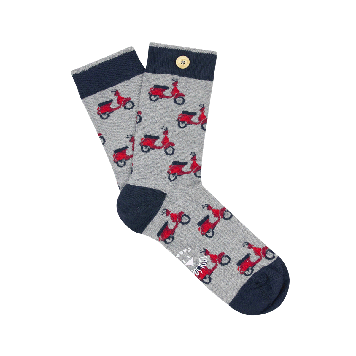 Die Socken verfügen über eine hübsche graue Palette mit dunkleren Farbdetails für Fuss, Ferse und Oberkante. Rote Scooter-Designs verleihen diesen Socken einen Hauch von Persönlichkeit. Ein kleiner Holzknopf ist an einer Socke, nahe der Spitze, für ein schönes dekoratives Detail angebracht.