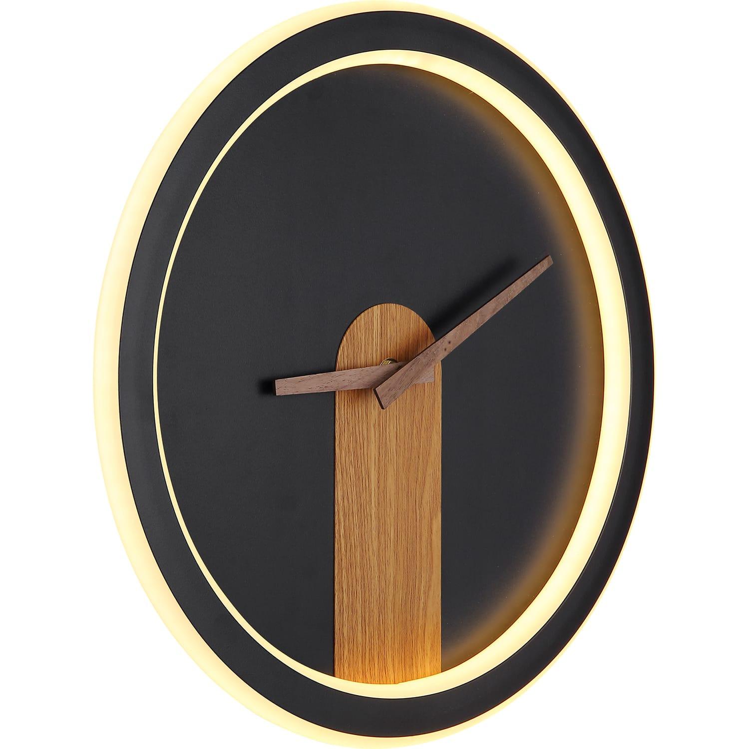 Diese Wanduhr ist ein einzigartiges und stilvolles Element, das Funktionalität und Design auf ansprechende Weise kombiniert. Sie besteht aus schwarz mattem Metall und Metall in dunkler Holzoptik, ergänzt durch opales Acryl. Diese Materialkombination verleiht der Uhr ein modernes und doch warmes Aussehen, das in viele Einrichtungsstile passt.Die Uhr hat einen Durchmesser von 310mm und eine Ausladung von 55mm, was sie zu einem markanten Element an jeder Wand macht. Ein besonderes Merkmal dieser Wanduhr ist ihre LED-Hintergrundbeleuchtung. Diese Beleuchtungsfunktion sorgt nicht nur für eine angenehme Atmosphäre, sondern macht die Uhr auch bei schwächerem Umgebungslicht gut lesbar.Die Uhr ist mit einem 20W LED-Modul (230V) ausgestattet, das eine starke Lichtquelle von 2291lm bietet. Der Licht-Output beträgt 825lm, was für eine effektive Beleuchtung sorgt, ohne zu blenden. Mit einer warmen Farbtemperatur von 3000K schafft diese Wanduhr eine einladende und gemütliche Atmosphäre.