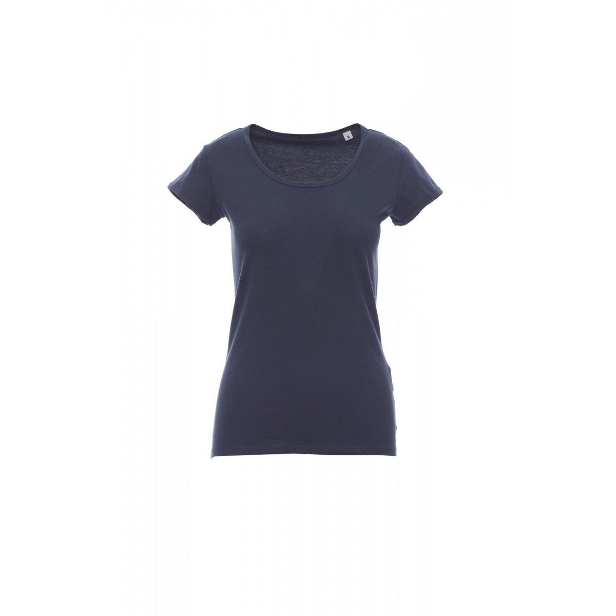 Dieses taillierte Damen-T-Shirt mit kurzen Ärmeln verfügt über einen leicht lockeren Rundhalsausschnitt mit feiner Borte. Die Ärmel sind mit einem dünnen, offenkantigen Umschlag versehen und es hat eine Seitennaht.