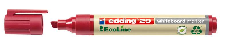 ECOLINE 29 - Boardmarker Der edding 29 whiteboardmarker mit Keilspitze ist ideal für das Schreiben auf Whiteboards und durch seine Cap-Off-Zeit auch nach offener Lagerung noch einsatzfähig. Durch die Verwendung von überwiegend recyceltem post-consumer Material ist er besonders umweltfreundlich. Nachhaltig, da Kunststoffteile insgesamt mindestens zu 90% aus recyceltem Material (83% post-consumer) Ideal zum Schreiben und Markieren auf Whiteboards Trocken abwischbar von fast allen geschlossenen Oberflächen, z.B. Whiteboards Cap-Off-Zeit: Whiteboard Marker ist bis zu einigen Tagen offen lagerfähig Nachfüllbar mit edding BTK 25 und edding BT 30 refill service Filterfasern aus recyceltem Material Ersatzspitzen für den Whiteboardmarker erhältlich Abfallreduzierung durch Nachfüllbarkeit
