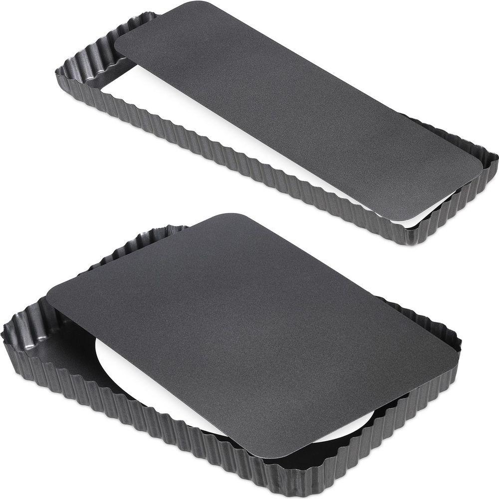 Materialtyp: Metall, Material: Stahl, Detailfarbe: Anthrazit, Set: Ja, Backform Typ: Tarte-Backform, Verpackungseinheit: 2 StückAus Metall,Kuchenformen ideal für Tartes und QuichesSpülmaschinenfest: NeinHebeboden erleichtert Entnahme des GebäcksAntihaftbeschichtung für leichtere LösbarkeitLieferumfang:2 x BackformGrösse Form rechteckig H x B x T: ca. 3.5 x 31 x 21.5 cmGrösse Form länglich H x B x T: ca. 2,5 x 35 x 11 cm