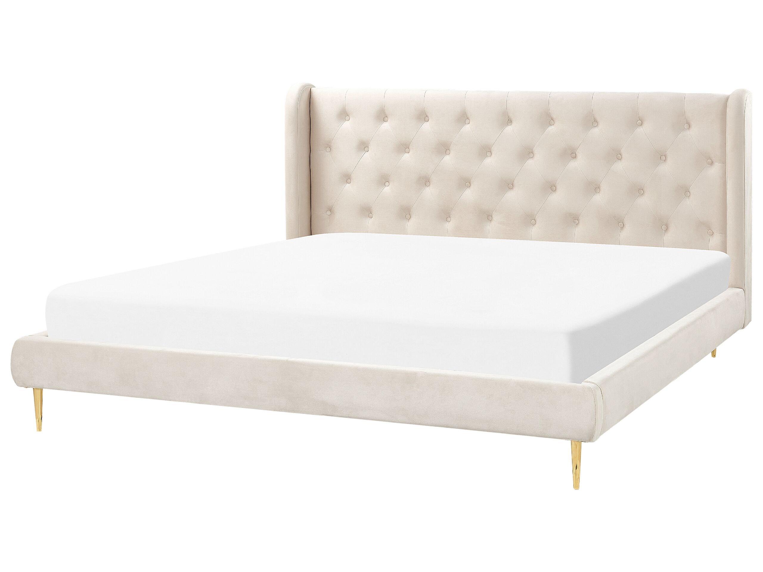 Trendy Bett aus Samtstoff in klsssichem Beige. Bringen Sie ein elegantes Flair in Ihr Schlafzimmer mit diesem Samtbett. Die hochwertige, strapazierfähige Polsterung mit sehr angenehmer Haptik in Kombination mit stabilen Metallbeinen in Gold strahlt Ruhe und Exklusivität aus. Das moderne Design wird durch das hohe, gesteppte Kopfteil betont. Das Bett ist zudem mit einem Lattenrost ausgestattet, der die richtige Gewichtsverteilung während der Nacht gewährleistet und für einen erholsamen Schlaf sorgt.