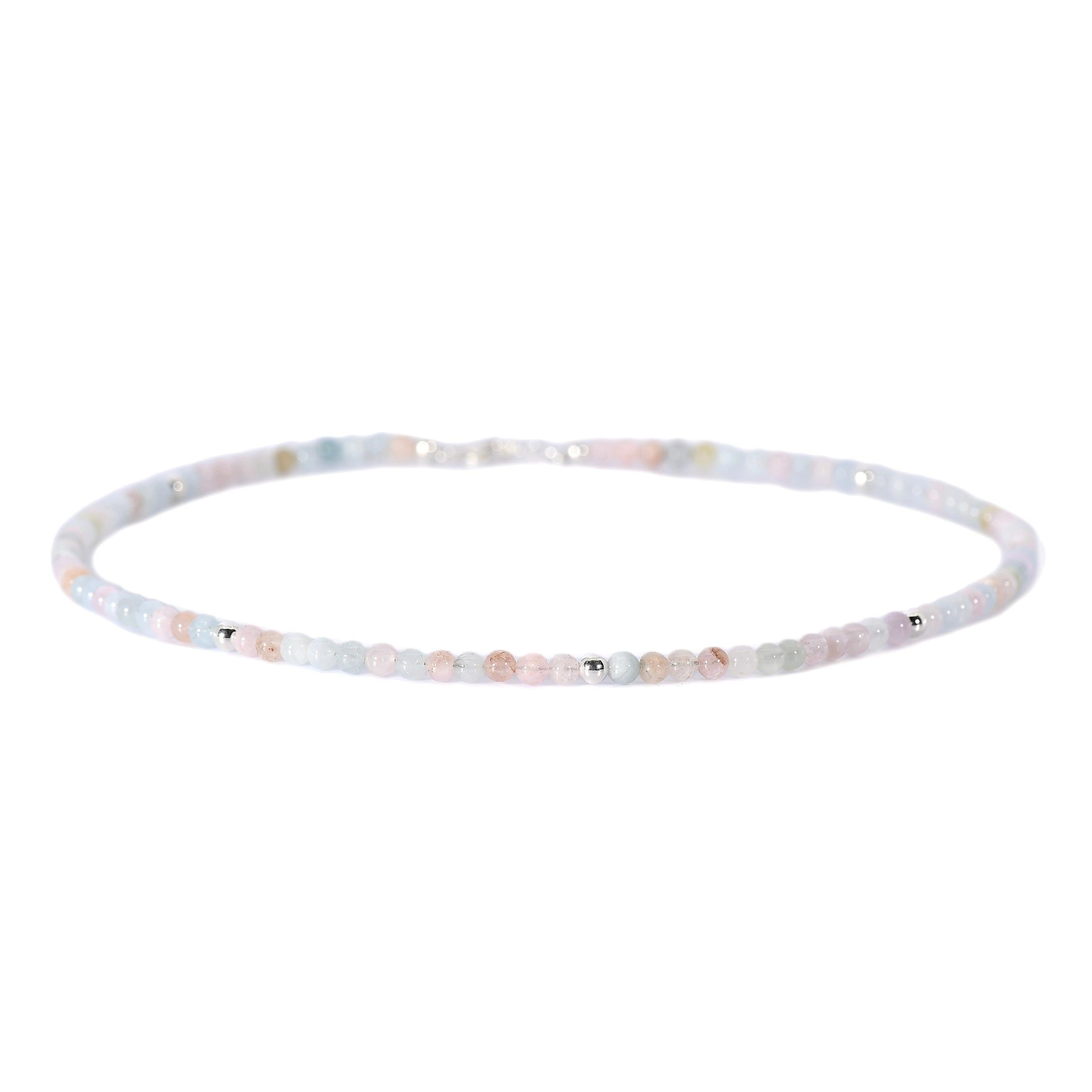 Diese bezaubernde Damen-Halskette vereint die sanften Töne von 4mm Achat-, Rosenquarz- und Morganit-Edelsteinen, kombiniert mit feinstem 925 Sterling Silber. Die zarten Steine verleihen der Halskette eine feminine Eleganz, die jedes Dekolleté mit einem Hauch von Anmut schmückt.