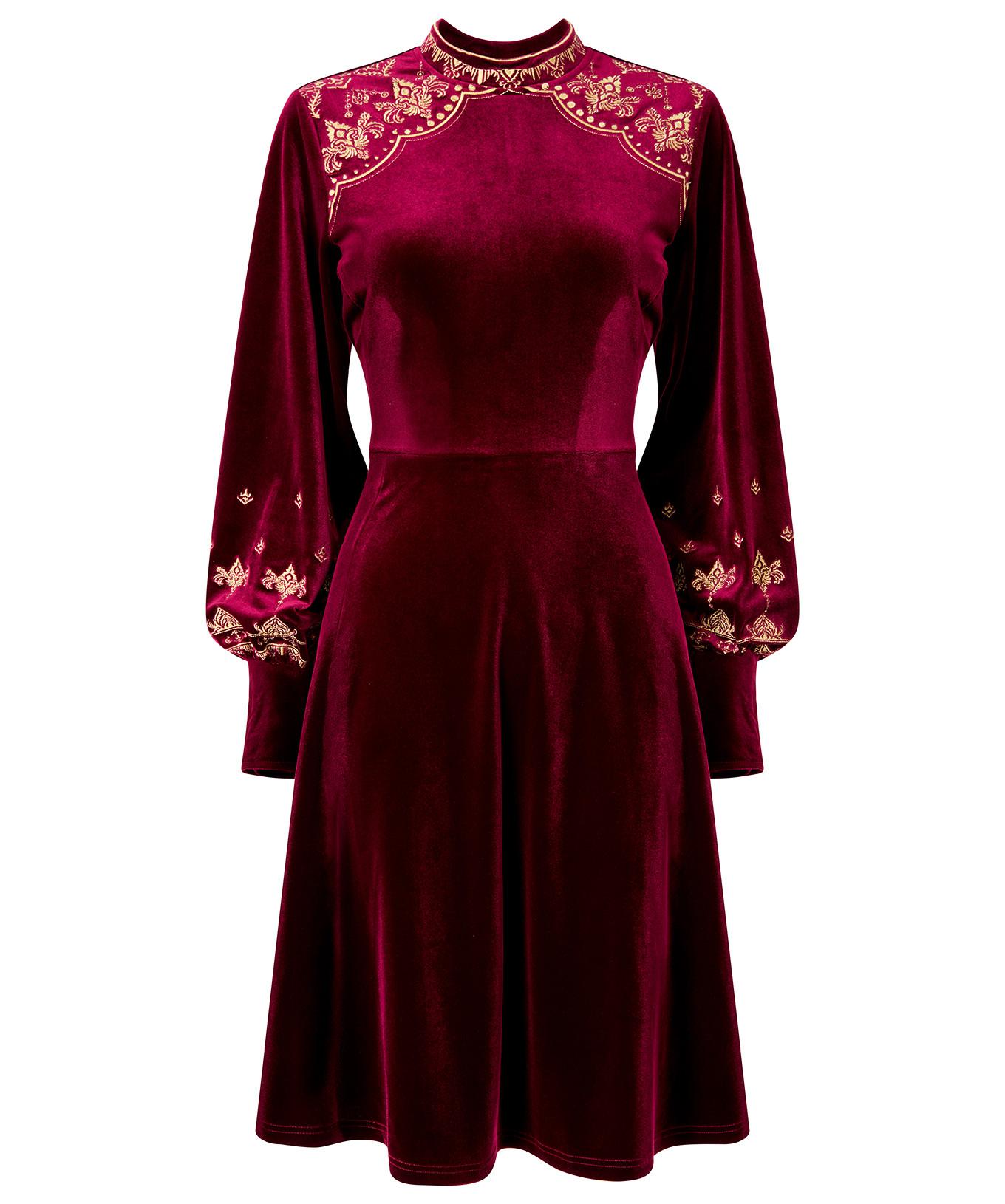 Dieses elegante Stretch-Samtkleid besticht durch aufwendige Stickereien, die dem Design einen Hauch von Raffinesse verleihen. Das Kleid ist aus einem weichen, dehnbaren Samtstoff gefertigt, der einen bequemen Sitz bei luxuriösem Tragegefühl gewährleistet. Der Stehkragen und die langen Ärmel tragen zur raffinierten Silhouette bei und machen es für verschiedene Anlässe geeignet.