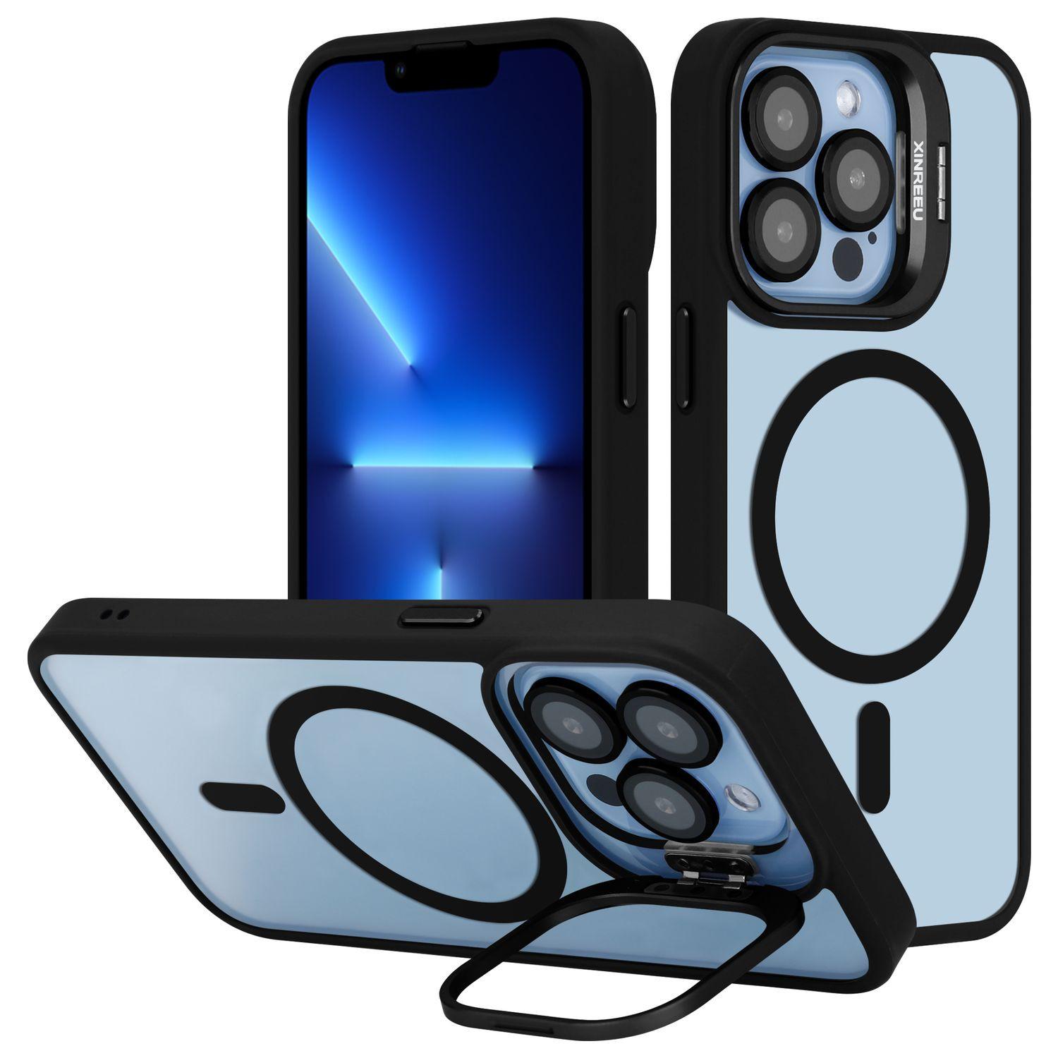 Cadorabo Hybrid Schutzhülle mit TPU Silikon-Rand und stabiler Rückseite, mit Standfunktion und kleinen runden Temperedgläser für Kameralinsen, Hülle kompatibel mit MagSafe