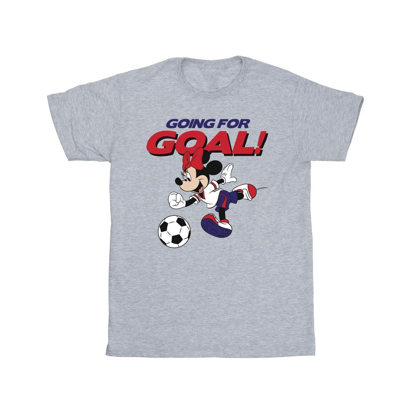 Dieses T-Shirt zeigt eine verspielte Grafik von Minnie Maus, die einen Fussball tritt, begleitet vom Text "GOING FOR GOAL!". Es ist eine bequeme und stilvolle Wahl für die Freizeit.