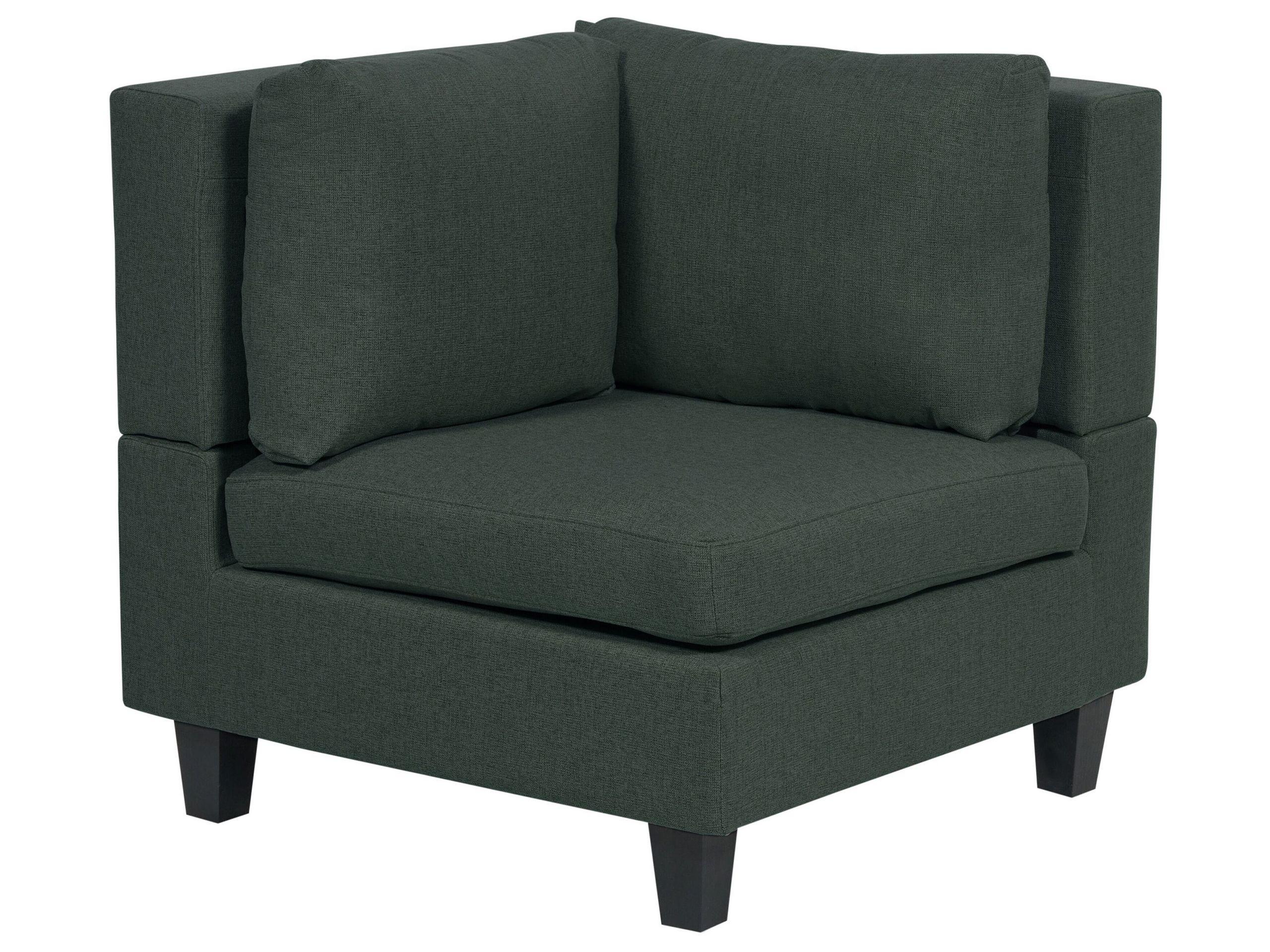 Modernes Eckmodul mit dunkelgrünem Stoffbezug und schwarzen Beinen. Dieses multifunktionale Eckmodul kann sich als eigenständiges Möbelstück in jedem Wohnbereich bewähren. In Kombination mit den anderen Modulen dieser Serie können Sie ein langes Sofa oder eine U-förmige Wohnlandschaft kreieren, da man die Sitzplätze mittels verdeckter Steckverbinder einfach und komfortabel miteinander verbinden kann. Der weiche Stoffbezug in edler Leinenoptik sorgt für ein herrliches Sitzgefühl, so dass Sie jede freie Minute mit Vergnügen auf dem Sessel verbringen werden. Zusätzliche Eleganz und Stabilität versprechen die dicken Kunststoffbeine.