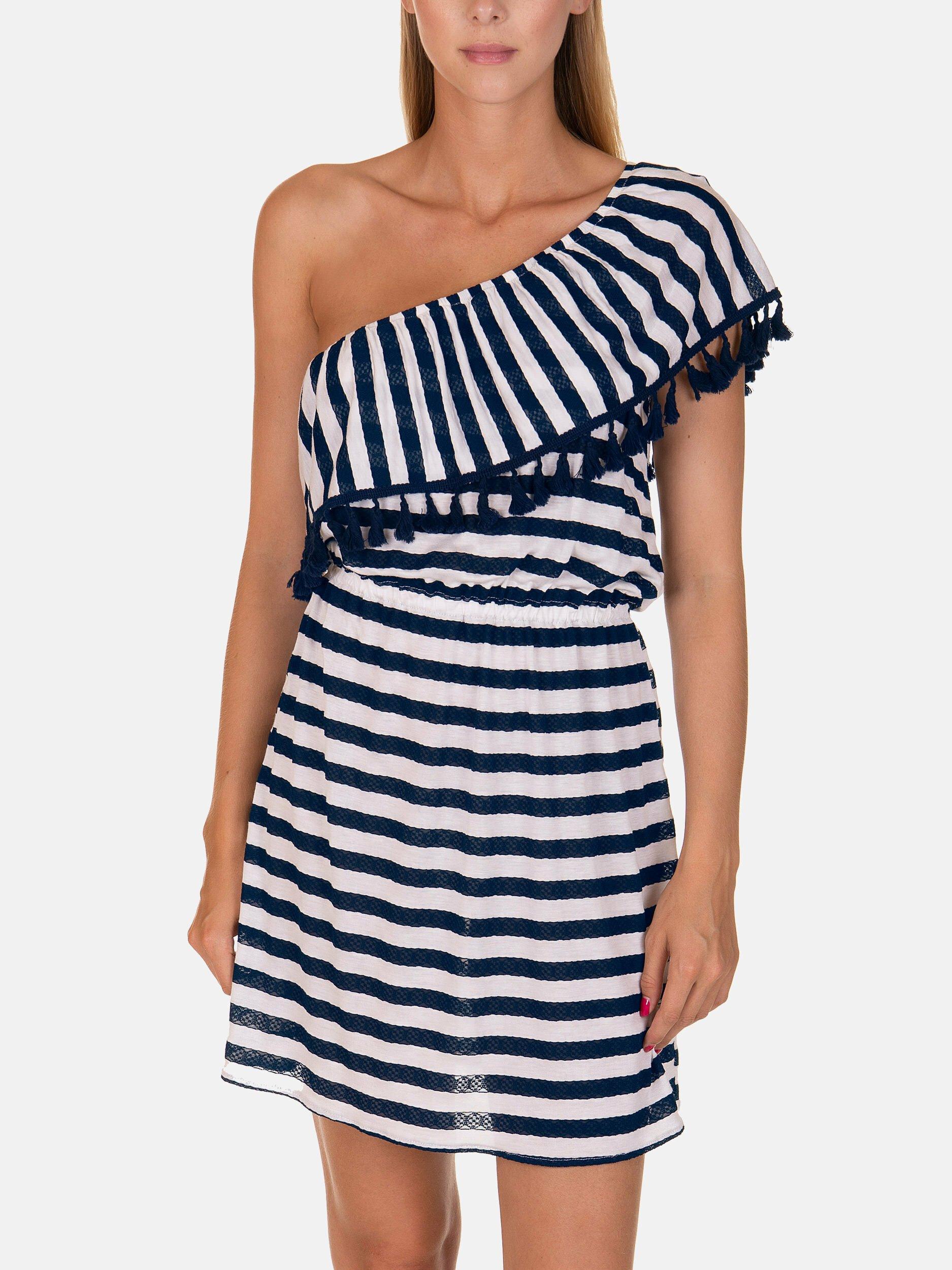 Attraktives und verspieltes Kleid, das sich perfekt für den Strand oder den täglichen Gebrauch eignet. Die Aufmerksamkeit wird auf den Ausschnitt mit einem breiten Volant gelenkt, der über eine Schulter getragen wird und für einen eleganten und originellen Look sorgt. Die elastische Taille betont die Form des weiblichen Körpers. Jacquard-Gewebe, verziert mit modischen und attraktiven Pompons, die den maritimen Stil mit ethnischen Elementen kombinieren. Der Streifenprint ist ein trendiger Look, der von Seeleuten inspiriert wurde. Der Stoff ist sehr angenehm zu tragen.