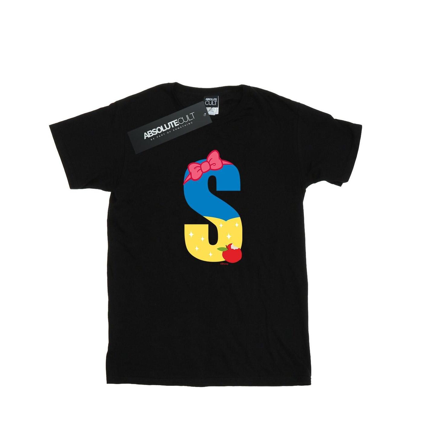 Dieses T-Shirt zeigt ein einzigartiges Design, inspiriert von der klassischen Disney-Figur Schneewittchen. Der Buchstabe 'S' ist mit Elementen verziert, die an Schneewittchens ikonisches Outfit erinnern, darunter eine rote Schleife, ein blaues Oberteil, ein gelbes Unterteil und ein roter Apfel. Dieses T-Shirt bietet eine bequeme Passform und eine spielerische Anspielung auf ein beliebtes Märchen.