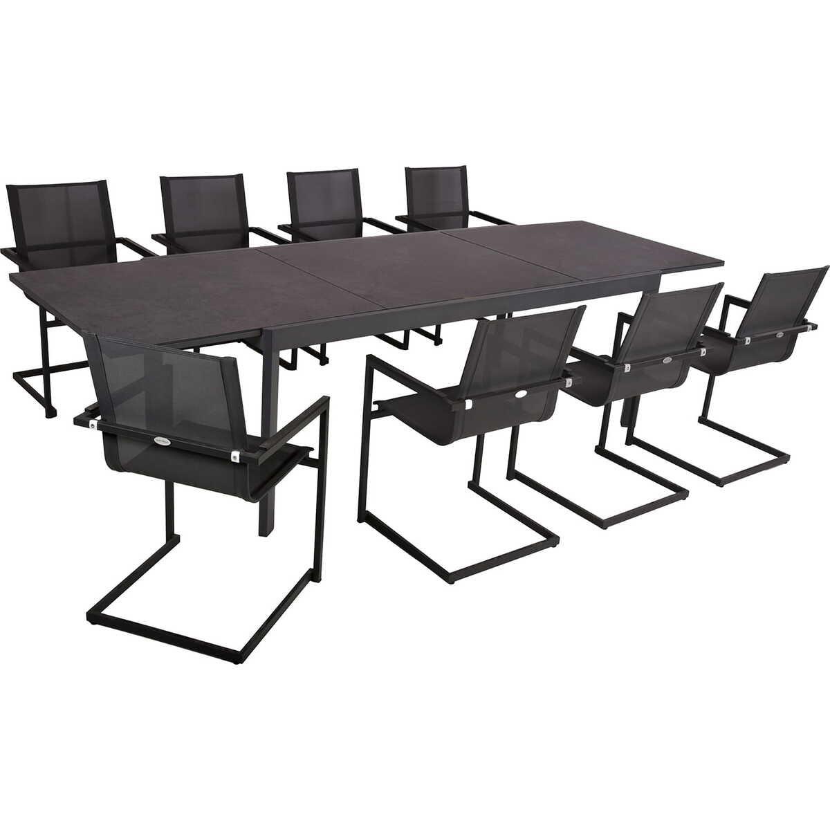 Entdecken Sie die Tischgruppe Nerea, eine Fusion aus Eleganz und Vielseitigkeit, entwickelt, um Ihren Innen- oder Aussenbereich stilvoll und komfortabel zu gestalten. Dieses Set, bestehend aus einem ausziehbaren Nerea Tisch und acht sorgfältig gestalteten Sophia-Stühlen, bietet eine beeindruckende Mischung aus Ästhetik und Funktionalität. Der Nerea Tisch, mit einer robusten pulverbeschichteten Anthrazit-Aluminiumstruktur und einer ansprechenden Glasplatte in Keramik-Optik, bietet sowohl Stabilität als auch eine ansprechende Ästhetik. Die Sophia-Stühle, gefertigt aus Edelstahl und bezogen mit anthrazitgrauem Kunststoffgewebe, bieten Komfort, Wetterbeständigkeit und einfache Pflege. Die Tischgruppe Nerea ist der perfekte Begleiter für grosse Versammlungen, Mahlzeiten im Freien oder gesellige Zusammenkünfte.