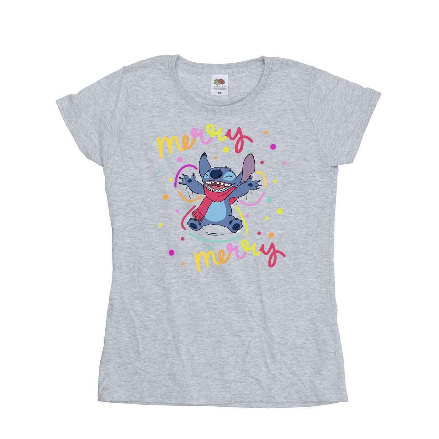 Dieses T-Shirt zeigt ein verspieltes Design mit Stitch aus Lilo & Stitch, umgeben von farbenfrohem "Merry"-Text und Konfetti. Das kurzärmlige Oberteil bietet eine bequeme normale Passform und ist eine fröhliche Ergänzung für jede Freizeitgarderobe.