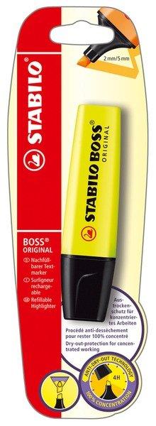 BOSS - Original Textmarker Der STABILO BOSS ORIGINAL ist ein Klassiker für Schule, Studium und Büro. Vor allem bei der Textvorbereitung arbeiten viele mit den handlichen Stiften: So lassen sich bequem wichtige Passagen in verschiedenen Farben markieren, um jederzeit den Überblick zu behalten. Mit Universaltinte auf Wasserbasis für alle Papiere Anwendungen: dank seiner hohen Offenlagerfähigkeit ist er ideal für konzentriertes Lesen und Lernen nachfüllbar