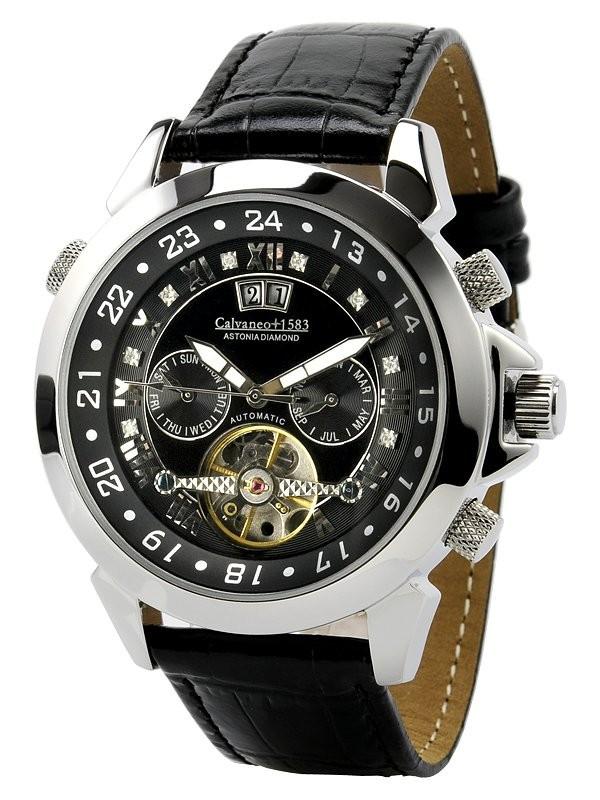 endlich ist es soweit - die astonia ist ab sofort als aufwendige diamanten besetzte version verfügbar. Diese traumhafte automatik komplikation wird einfach jeden in ihren bann ziehen und stellt die krönung der astoniaserie von calvaneo dar. Freuen sie sich jetzt schon darauf wenn sie diese uhr am handgelenk tragen, die neugierigen blicke anderer werden ihnen sicher sein. alle details und ausstattungsmerkmale auf einen blick: · automatikkaliber mit 35 steinen gelagert· sichtbare unruhe - aufhängung mit zwei gebläuten schrauben befestigt auf 6 uhr-position· komplettes edelstahlgehäuse hochglänzend mit acht echten 1,1 mm diamanten besetzt (si mixed)· edles "shiny black" zifferblatt· erhabene silberne römische stundenindices· innenliegende 24 stundenanzeige, für 2. Zeitzone einstellbar