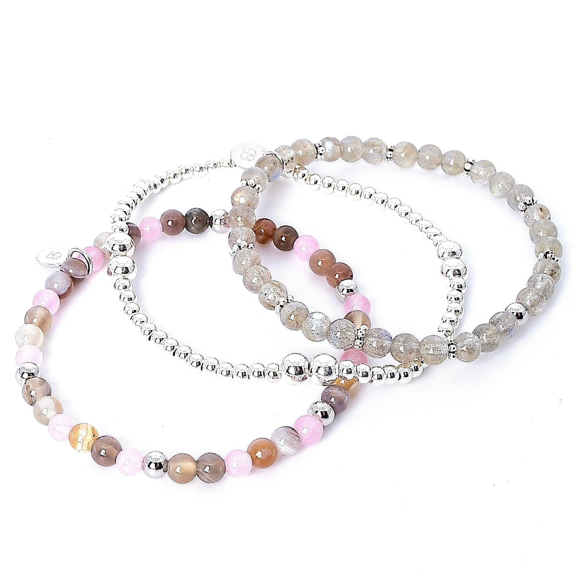 Dieses liebevoll zusammengestellte 3er-Armband-Set vereint feminine Eleganz mit natürlicher Kraft. Der zarte Rosenquarz steht für Liebe und Mitgefühl, während Achat innere Ruhe schenkt. Labradorit verleiht dir mystische Tiefe und Intuition. Abgerundet wird das Ensemble durch ein edles Armband aus reinem 925 Sterling Silber schlicht und elegant.