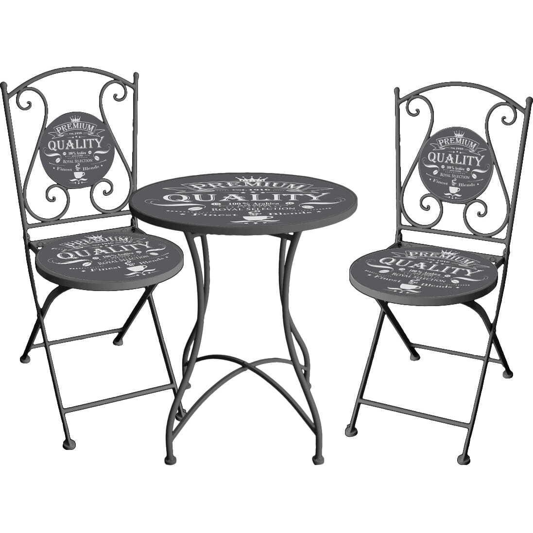 Hochwertiges Metallmaterial für Langlebigkeit Elegantes, dunkelgraues Finish passt zu verschiedenen Einrichtungsstilen Romantische Sitzgelegenheit für Zwei Robuste Konstruktion garantiert Stabilität Tisch bietet ausreichend Platz für Snacks und Getränke Maximale Belastbarkeit: 120 kg je Stuhl, 50 kg für den Tisch