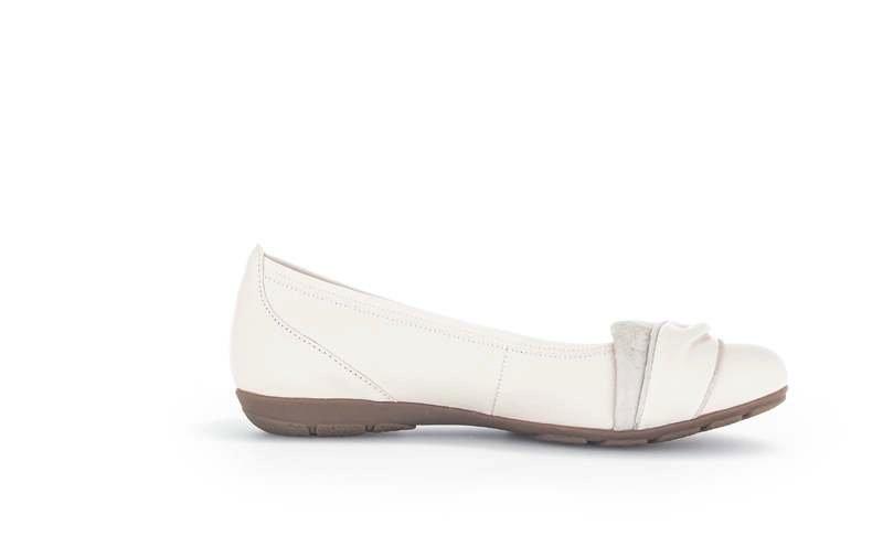 Gabor 24.165.22. Bequemer Ballerina. Dieser außergewöhnlich bequeme Ballerinaschuh zeichnet sich durch sein leichtes Design aus. Das Textil-Leder-Futter garantiert eine optimale Passform und perfekten Halt für Rist und Achillessehne. Dieses cremefarbene Damenmodell besteht aus elastischem Textil im Vorderfußbereich mit Einsätzen aus weichem Leder.