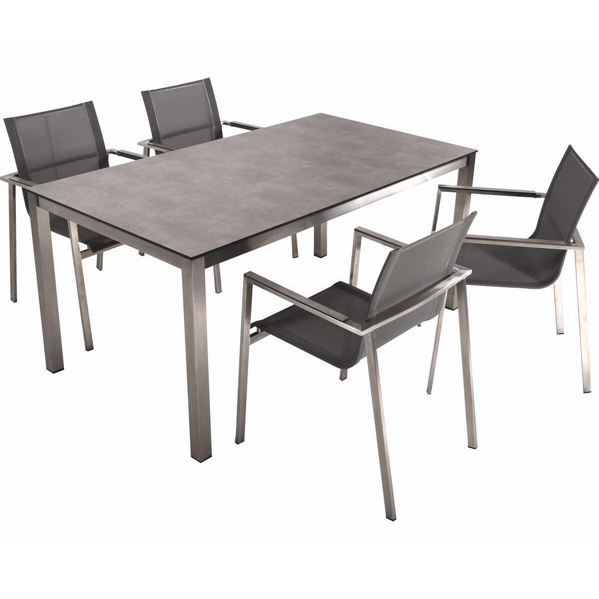 Die Tischgruppe Sienna setzt neue Massstäbe in Sachen Stil und Komfort. Mit einem Tisch und vier passenden Stapelstühlen aus hochwertigen Materialien und zeitlosem Design, fügt sich dieses Set nahtlos in jede Einrichtung ein. Die Kombination aus gebürstetem Edelstahl und robustem HPL-Material in stimmigen Farben sorgt für eine moderne, elegante Optik und garantiert Langlebigkeit. Die Sitz- und Rückenflächen der Stühle aus pflegeleichtem Kunststoffgewebe bieten hohen Sitzkomfort. Ob im Esszimmer, Wohnbereich, Büro oder Konferenzraum, die Tischgruppe Sienna ist immer eine stilvolle Ergänzung.