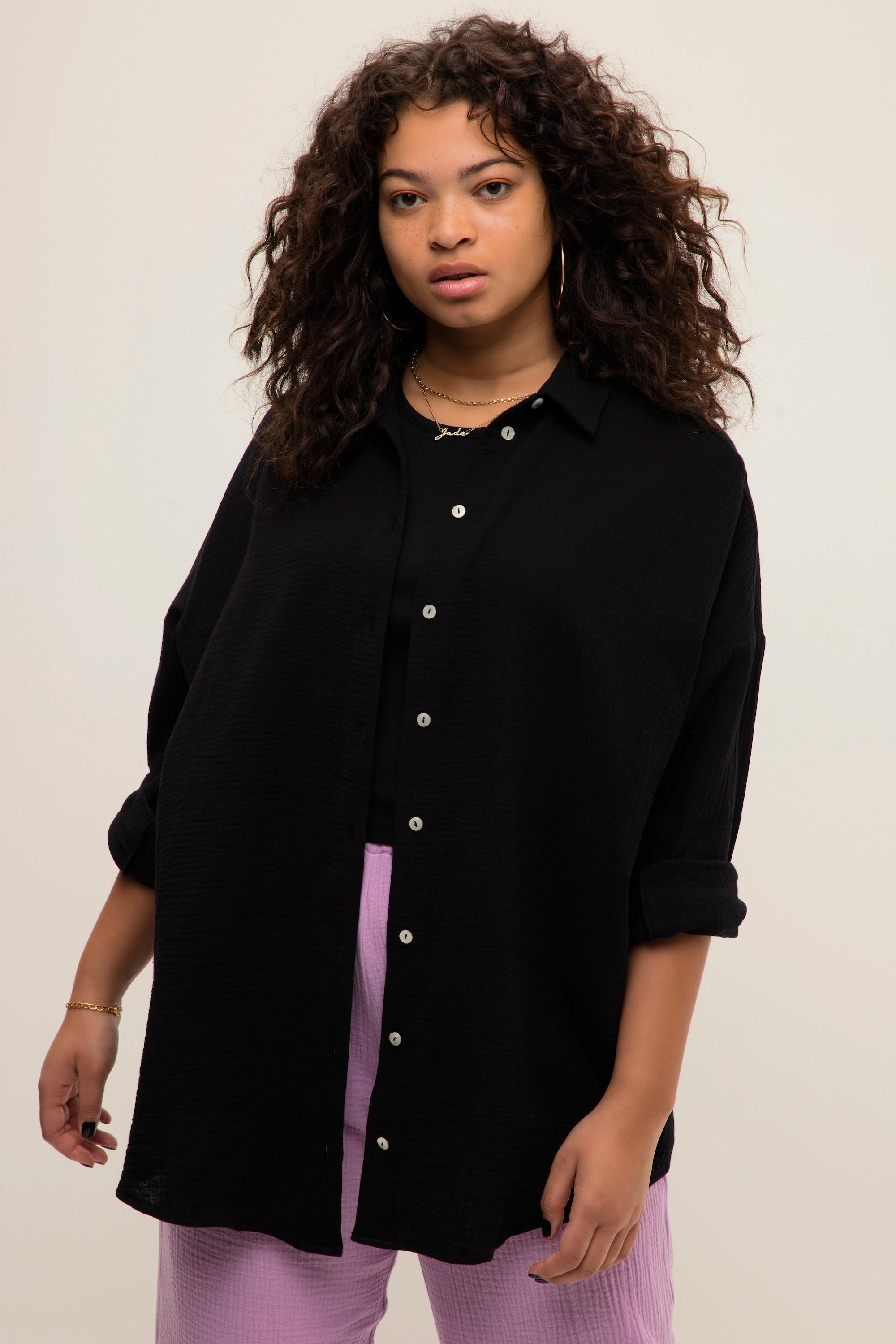 Diese oversized Musselin-Bluse verfügt über einen klassischen Hemdkragen und lange Ärmel, was einen entspannten und dennoch stilvollen Look bietet. Das leichte Material sorgt für Komfort und Vielseitigkeit und macht sie für verschiedene Anlässe geeignet.